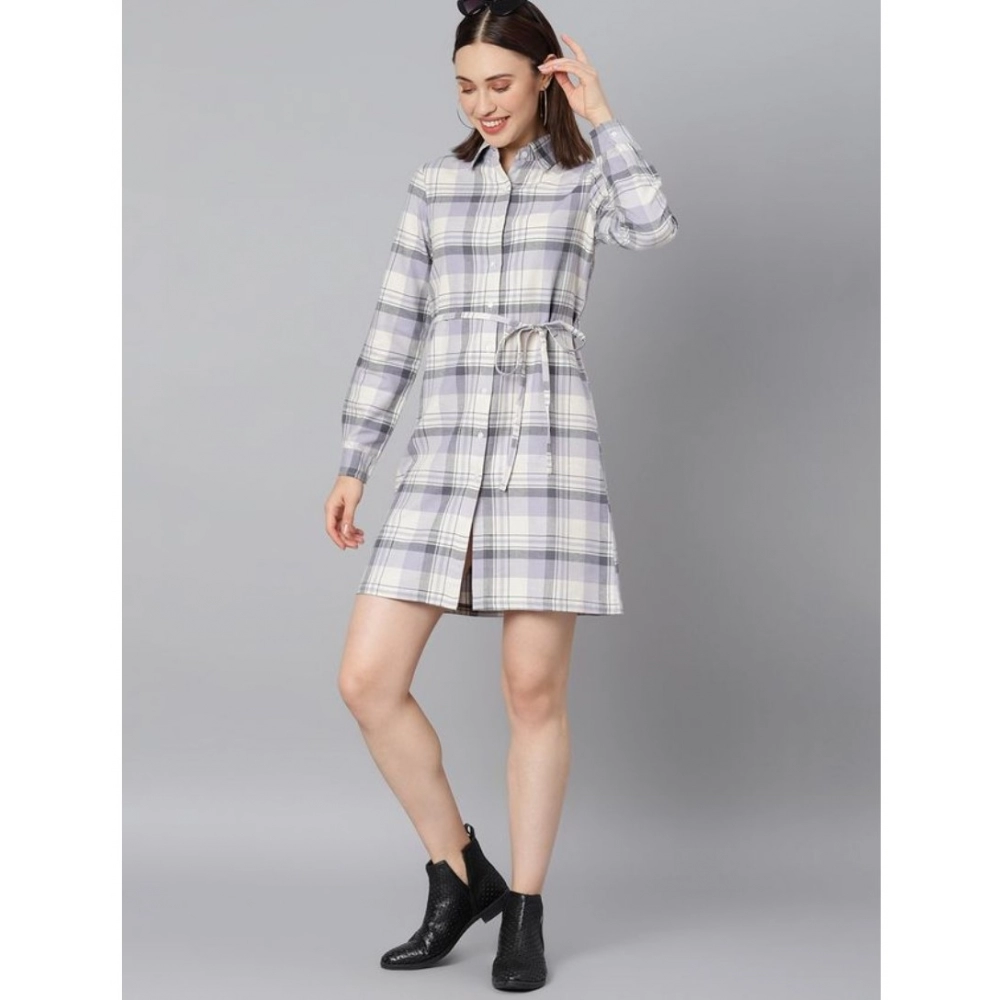 Generic Women’s Cotton Checkered Long Sleeves Above Knee Dress (Grey)