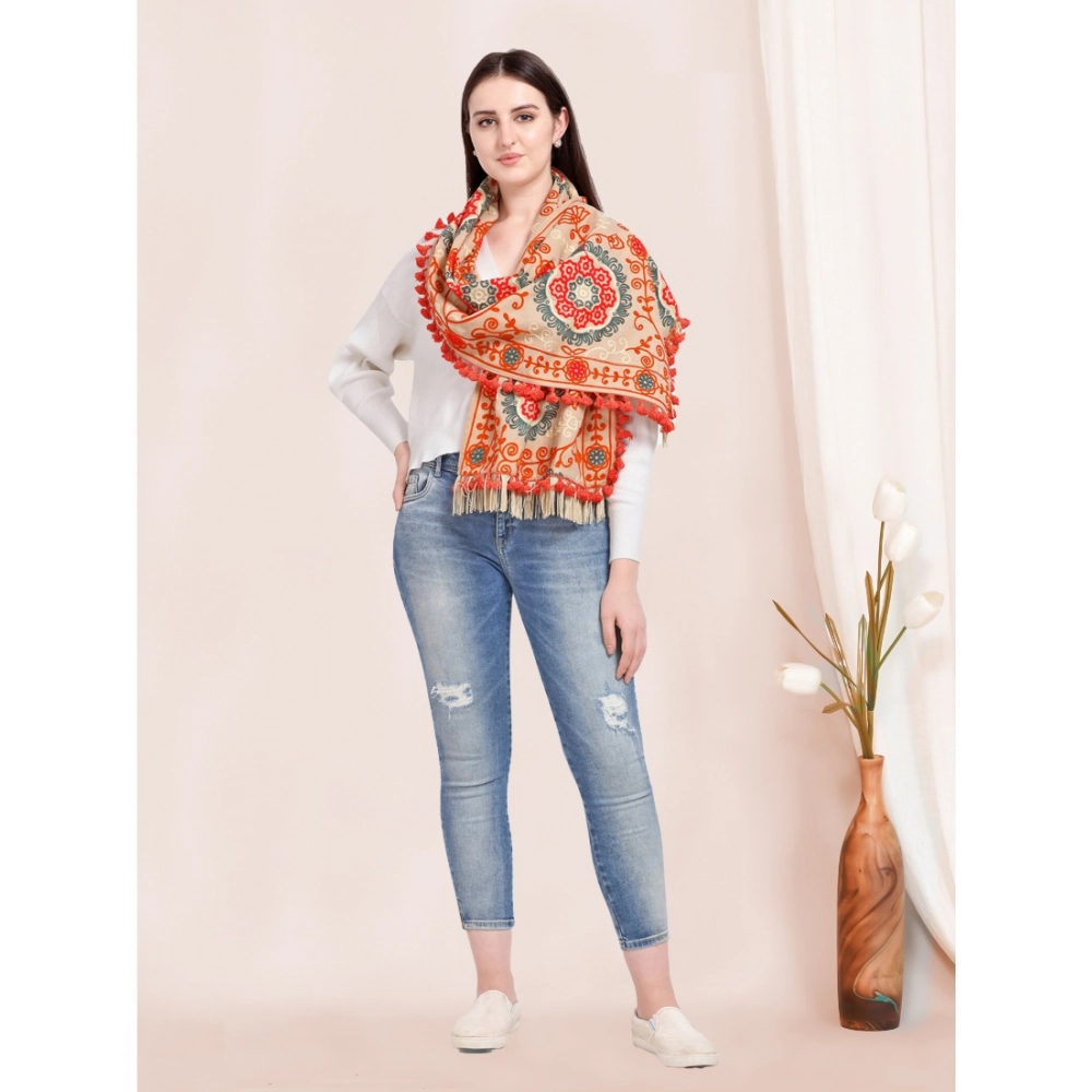 Generic Women’s Cotton Embroidered Muffler (Beige, Length: 0.5 to 1 Mtr)