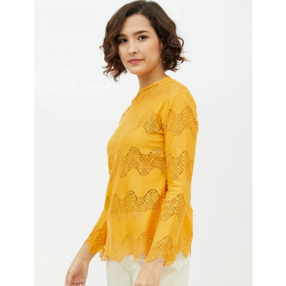 Generic Women’s Cotton Lace Inserts Long Sleeves Top (Yellow)
