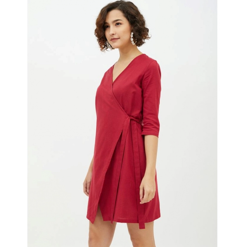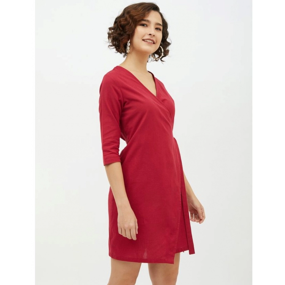 Generic Women’s Cotton Wrap 3-4th Sleeves Above Knee Dress (Maroon)