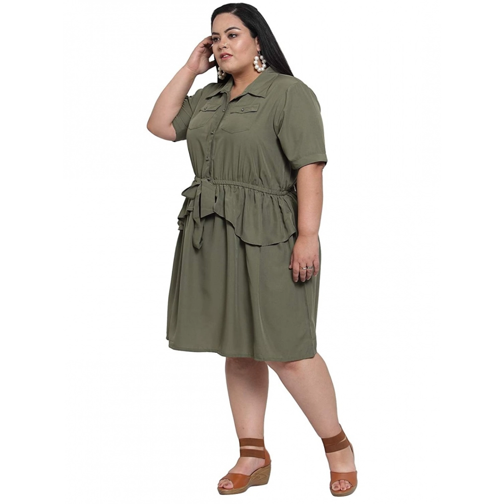 Generic Women’s Crepe Solid Knee Length Fit and Flare Dress (Olive Green)