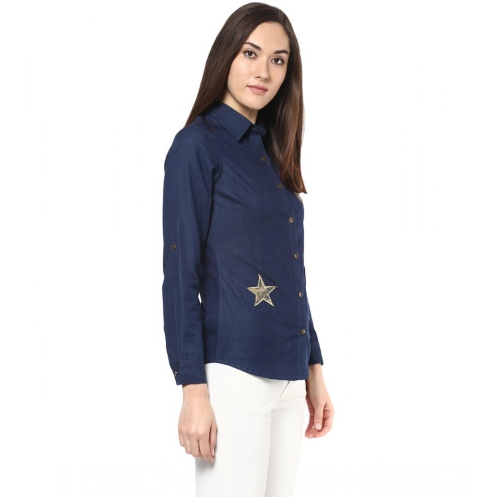 Generic Women’s Denim Patch Work Long Sleeves Standard Length Shirt (Blue)