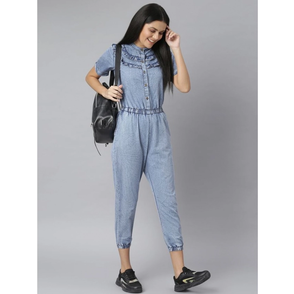 Generic Women’s Denim Self Design Tie Ups Jumpsuit (Blue)
