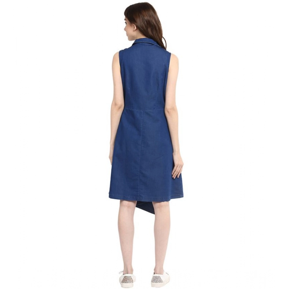 Generic Women’s Denim Solid Collar Neck Sleeveless Dress (Blue)