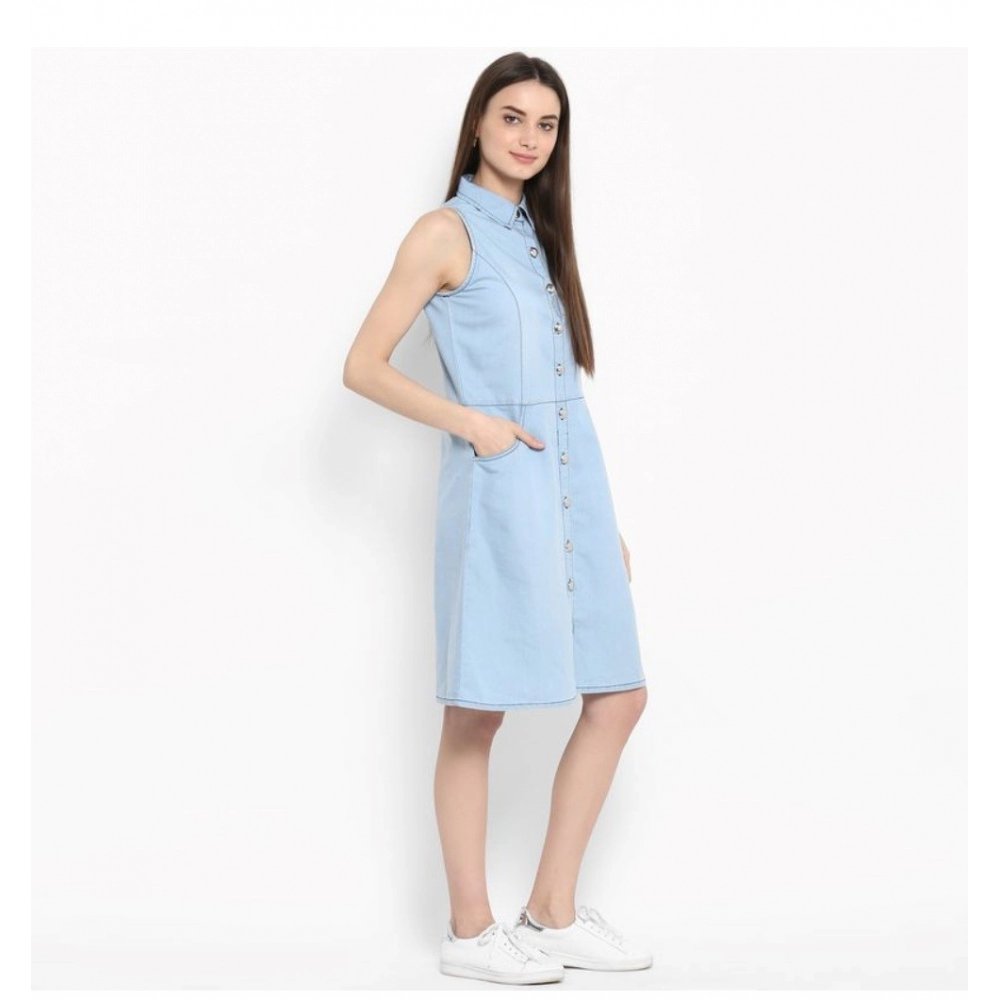 Generic Women’s Denim Solid Sleeveless Below Knee Dress (Blue)