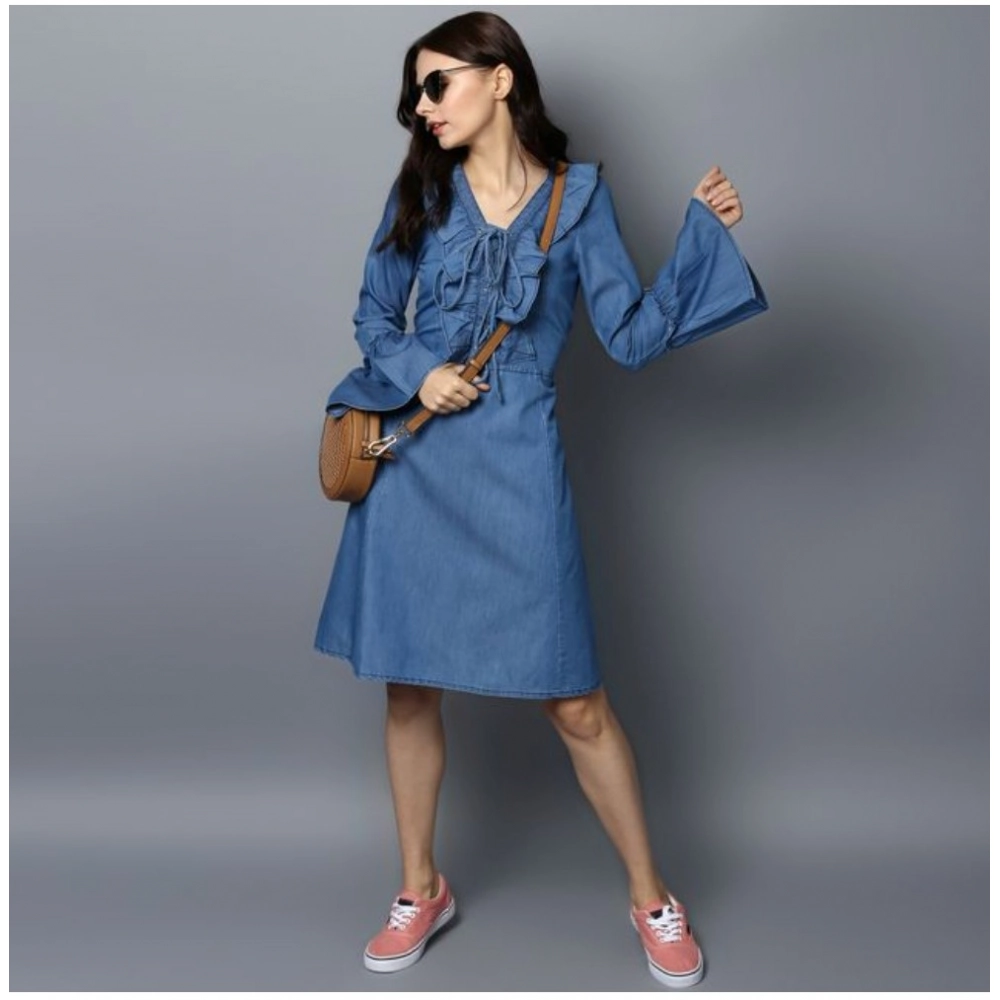 Women’s Denim Solid V-Neck Bell Sleeve Dress