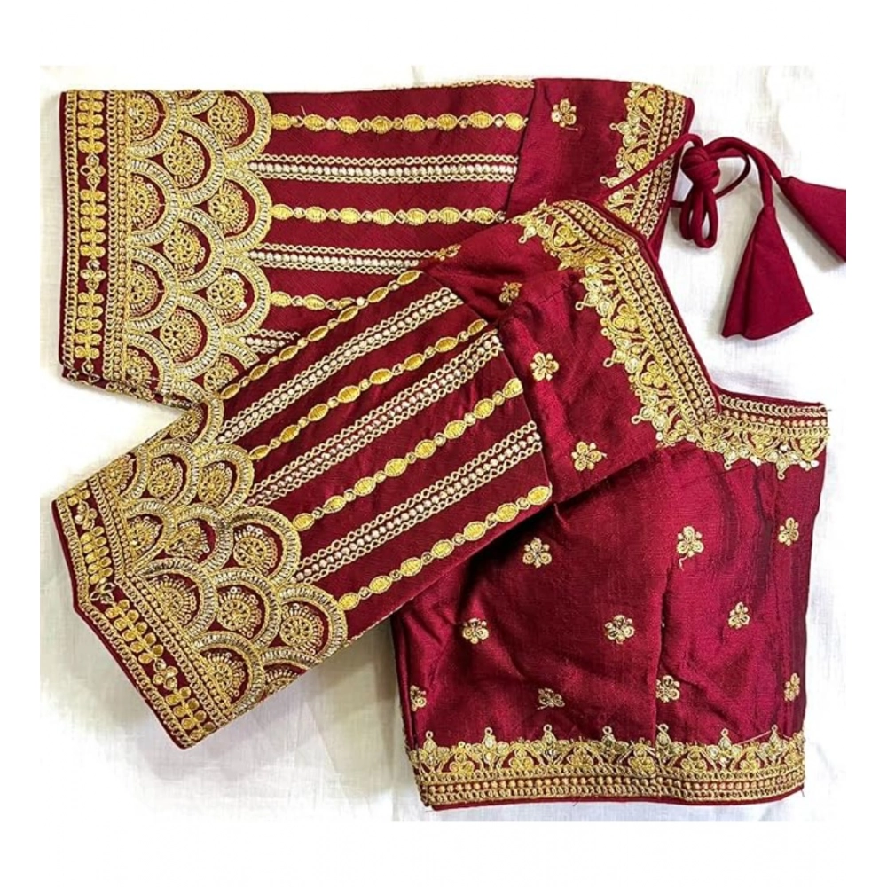 Generic Women’s Phantom Silk Embroidery Round Neck Short Sleeve Readymade Blouse (Brown, Free Size)