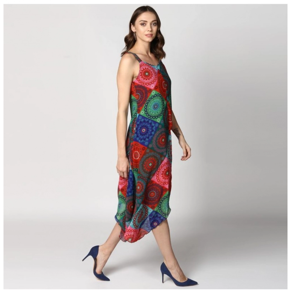 Generic Women’s Polyester Asymmetrical Shoulder Straps Knee-Length Dress (Multicolor)