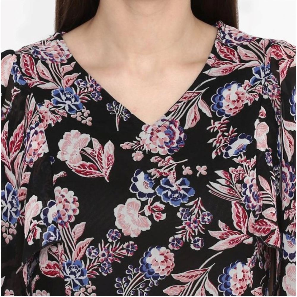 Generic Women’s Polyester Floral Short Sleeve Knee-Length Dress (Black – Multicolor)