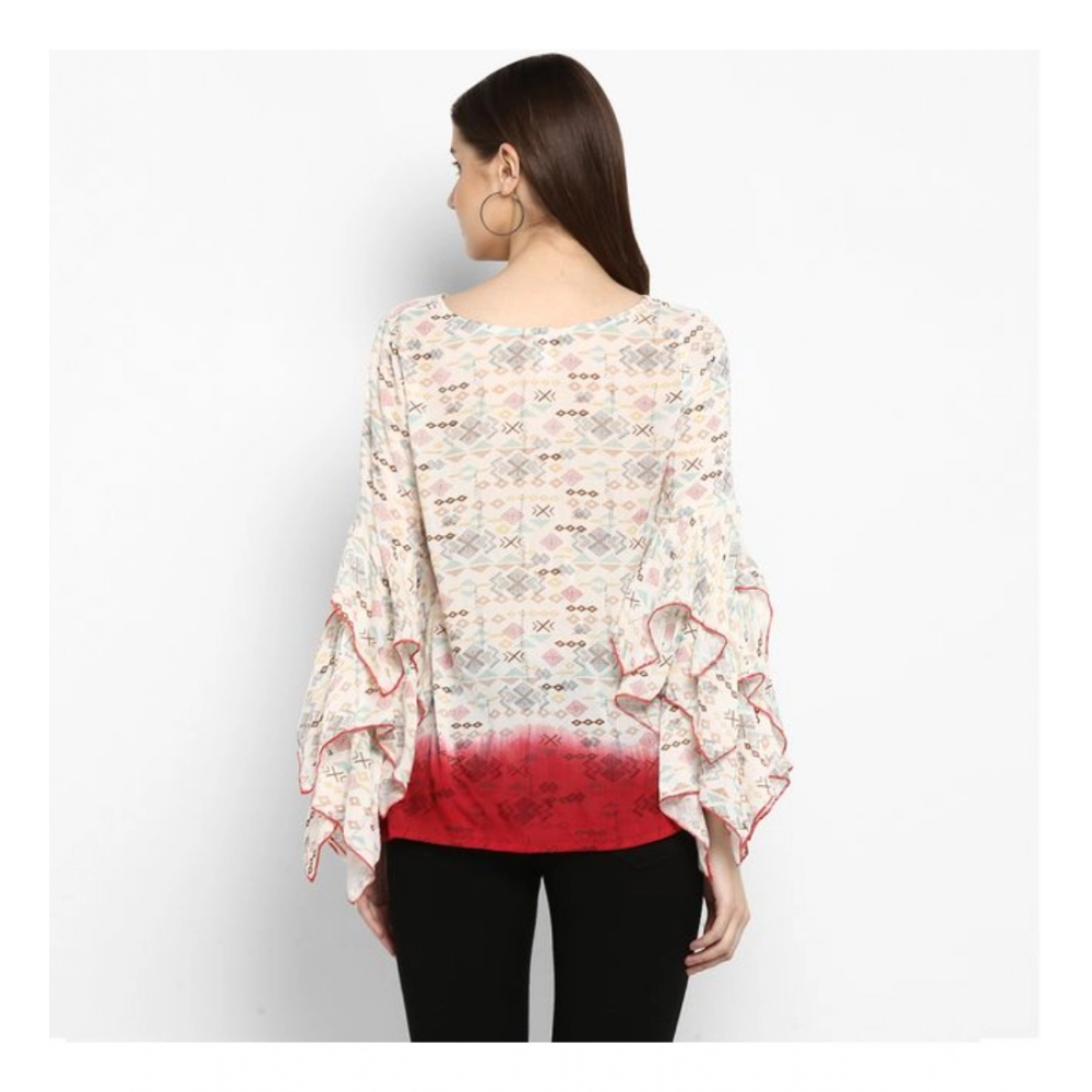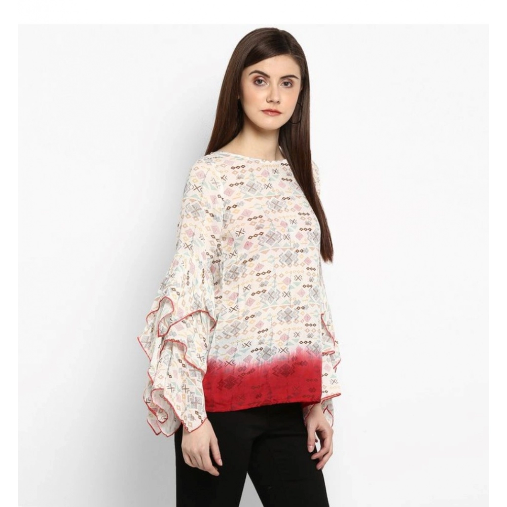 Generic Women’s Rayon Crepe Printed Ruffle Sleeve Top (Off White – Red)