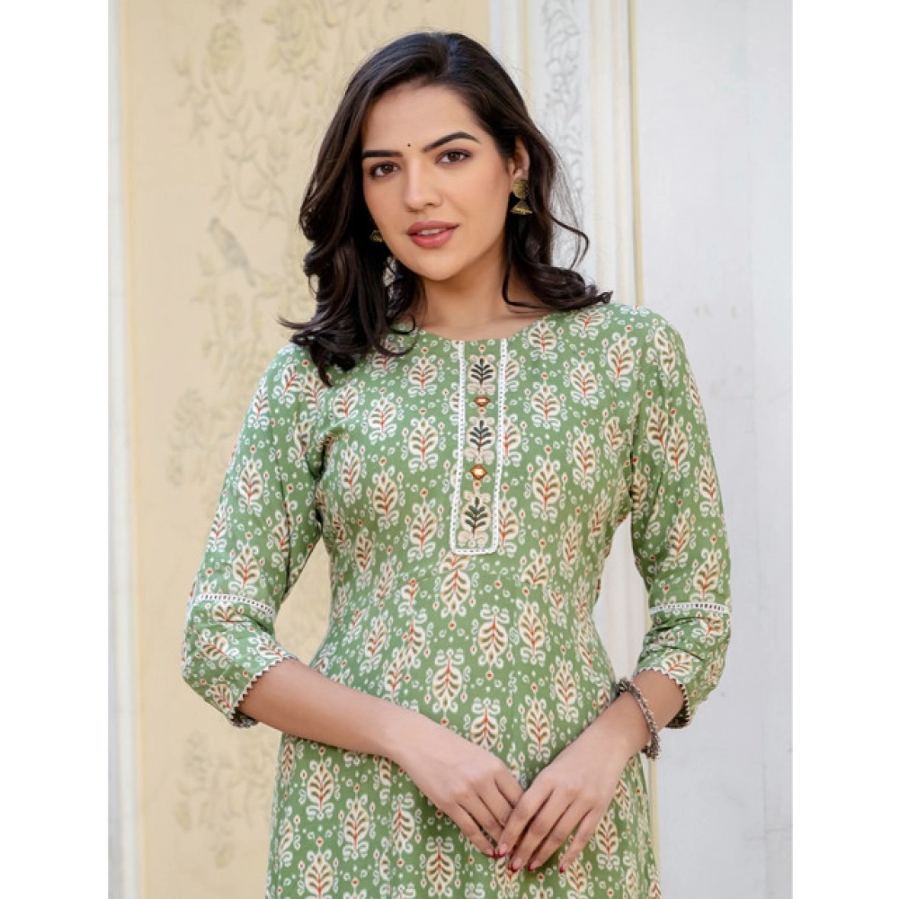 Generic Women’s Rayon Print With Embroidery Work A-Line Kurti (Green)