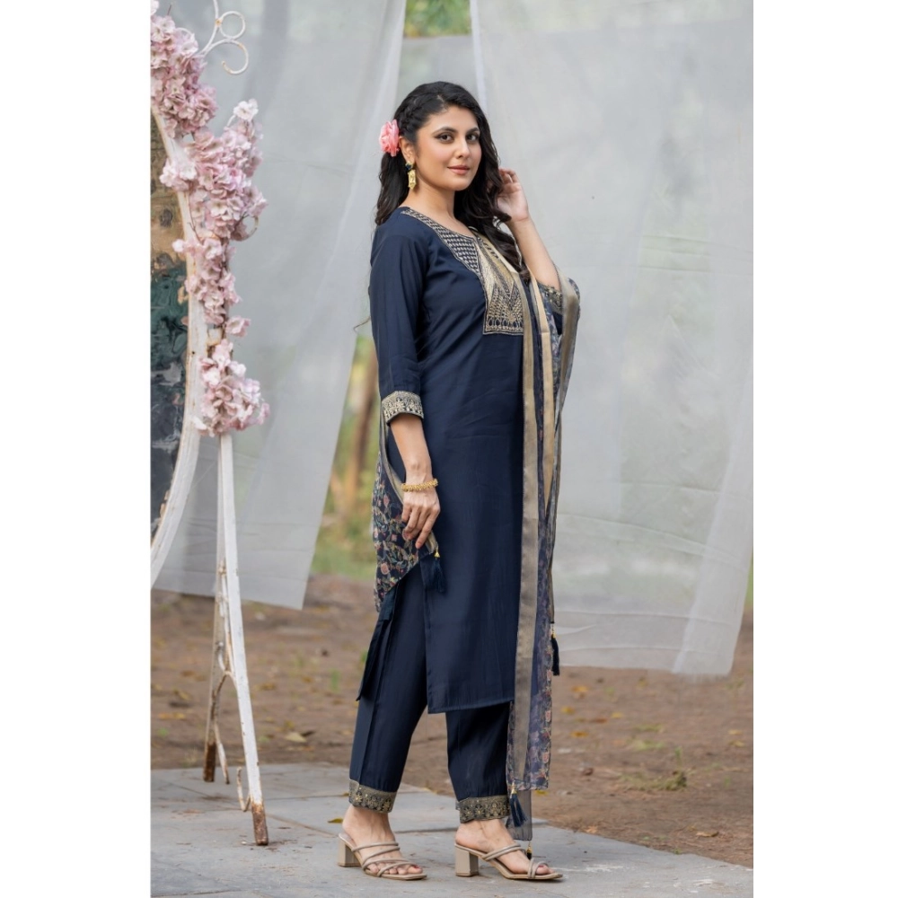 Generic Women’s Rayon Printed V Neck Kurti with Pant and Dupatta Set (Navy Blue)