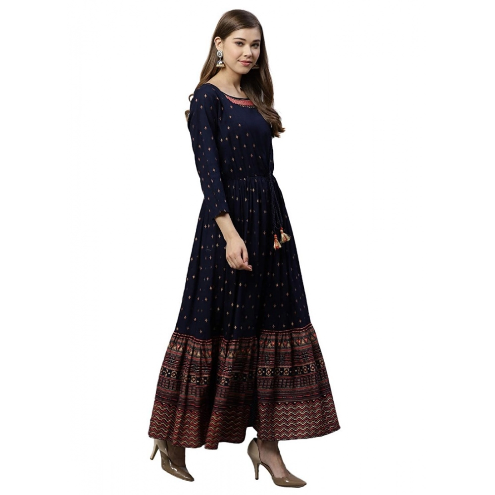 Generic Women’s Rayon Printed Viscose Regular Kurti (Navy Blue, Rayon)