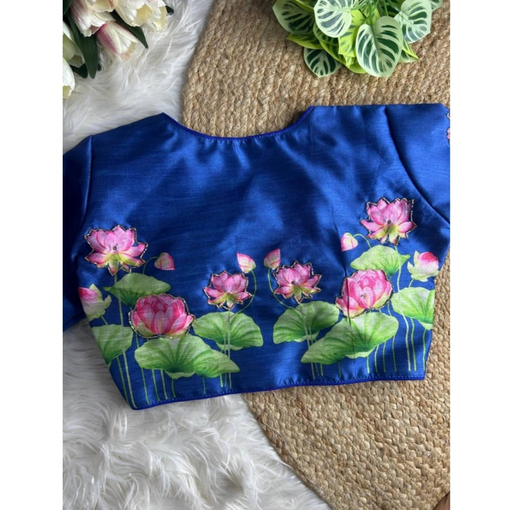 Generic Women’s Silk Hand Work Round Neck Short Sleeve Readymade Blouse (Blue, Free Size)