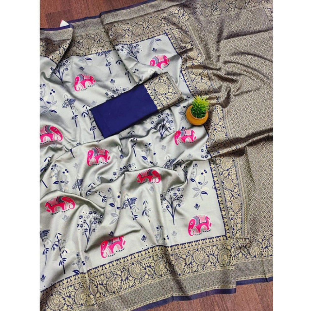 Generic Women’s Soft Litchi Silk Jacquard Work Saree With Unstitched Blouse 5.5Mtr (Blue)