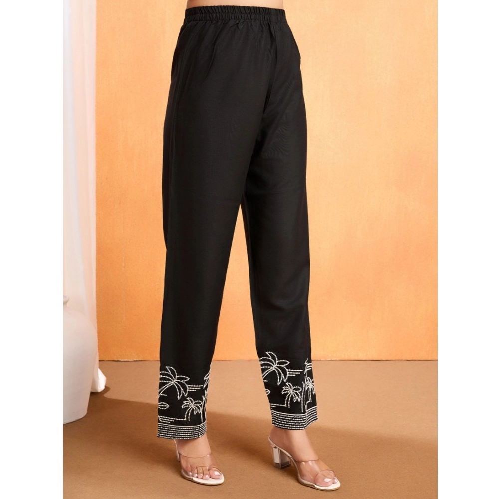 Generic Women’s Viscose Rayon Embroidered Chinese Collar Kurti with Pant Set (Black)