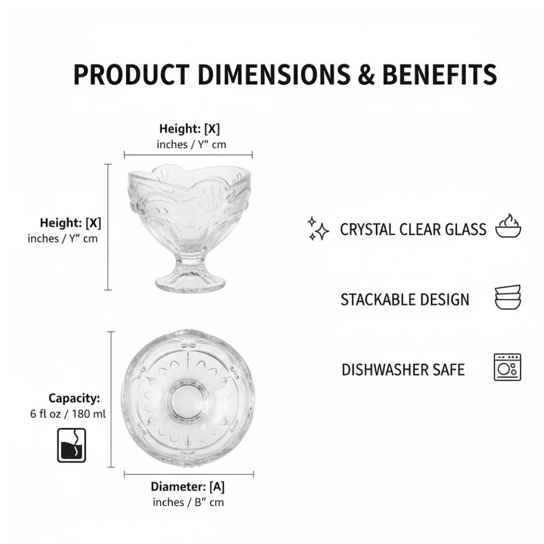 Glass Ice-Cream Cup Set, Home & Kitchen Serving or Dessert Cup for Sundae, Sweets, Snacks, Fruit, Pudding, Nuts or Dip, Serving Bowls, Pure Glass (6 Pcs Set)