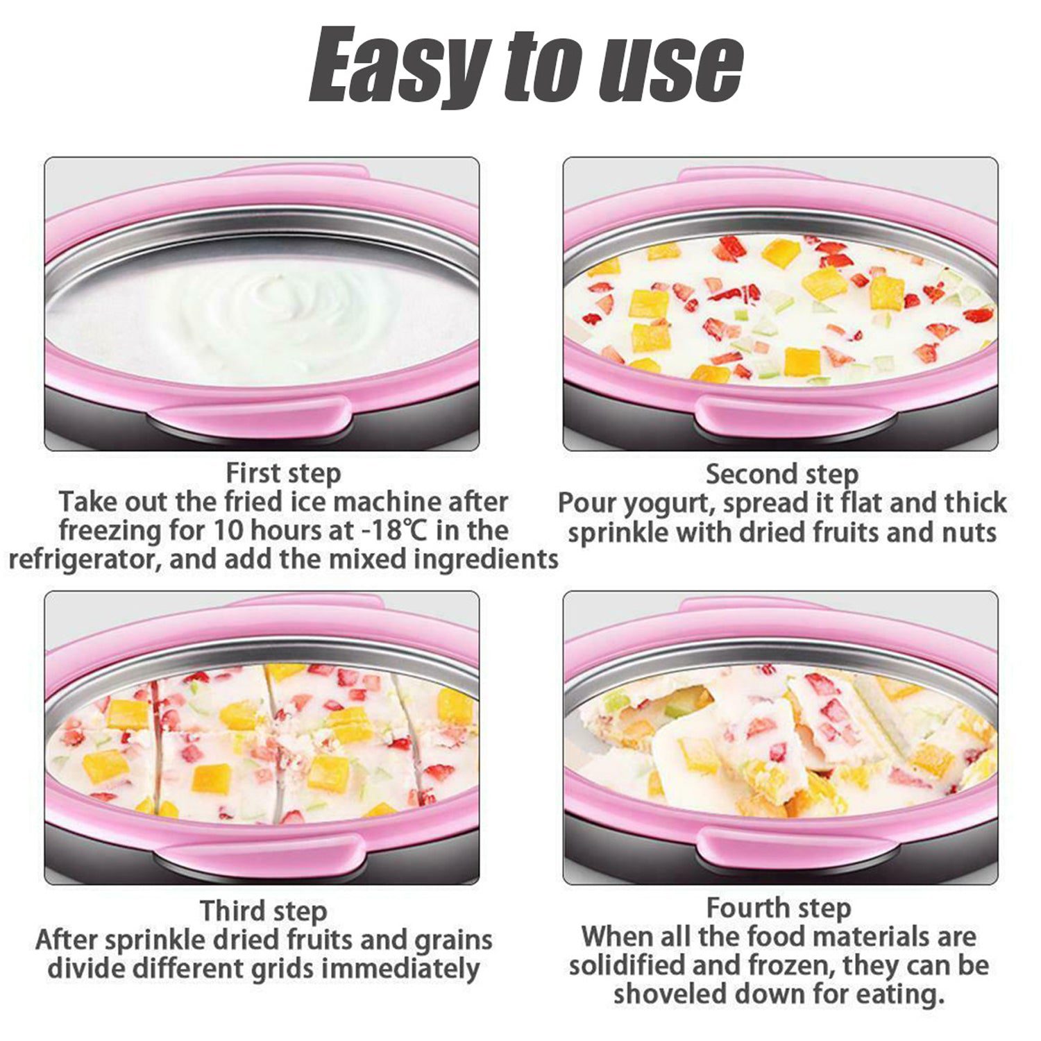 - Easy to Use: No need to power on, just need a refrigerator. Place upside down the ice cream pan maker in the freezer to cool above 8 hours, when ready pour your mix into ice cream pan and stir, then let stand until ice cream is formed.
