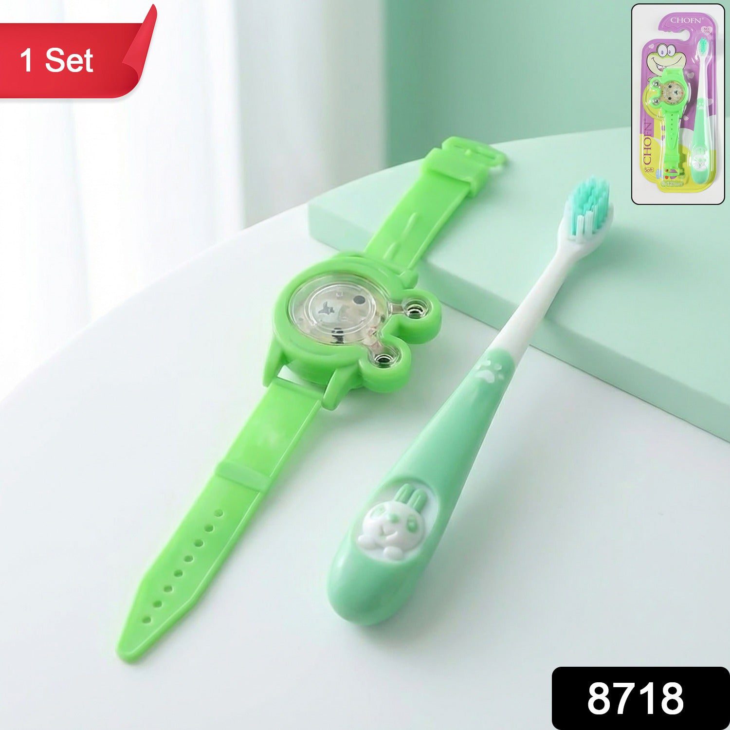 Set Includes: 1 Toothbrush, 1 Cartoon Watch.