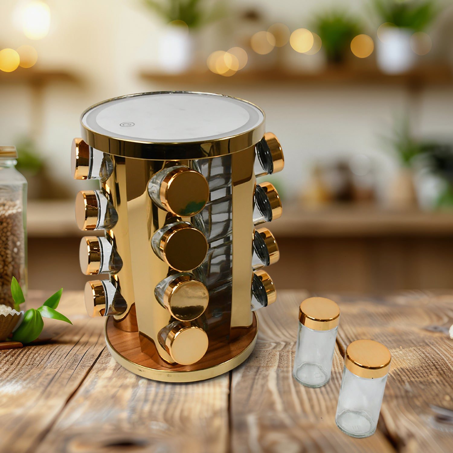 10009 LED Spice Rack Organizer, Rotating Spice Rack with Free 16 Seasoning Jars, Revolving Tower Organizer Stainless Steel for Kitchen Storage (Golden / 16 Pc / MOQ – 6 pc)