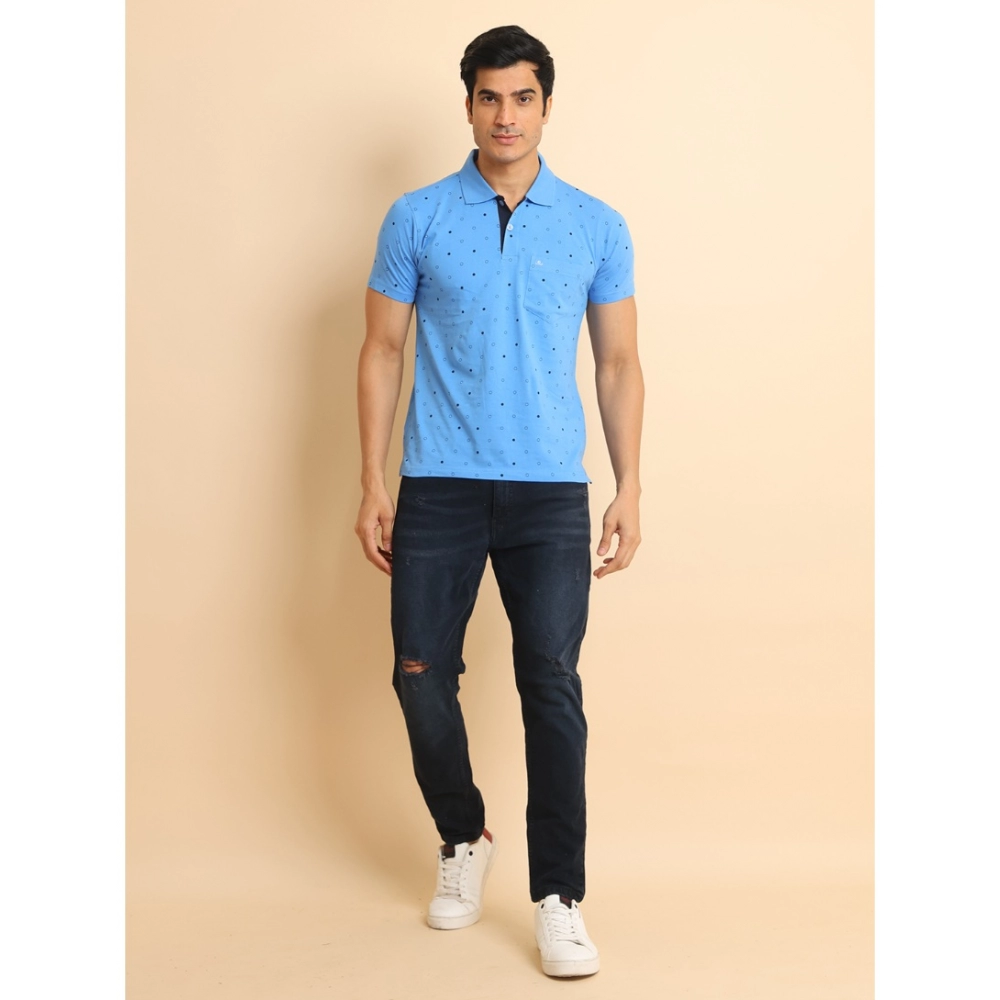 Elegant Men’s Blue Printed Cotton Polo Neck Half Sleeve T-Shirt
