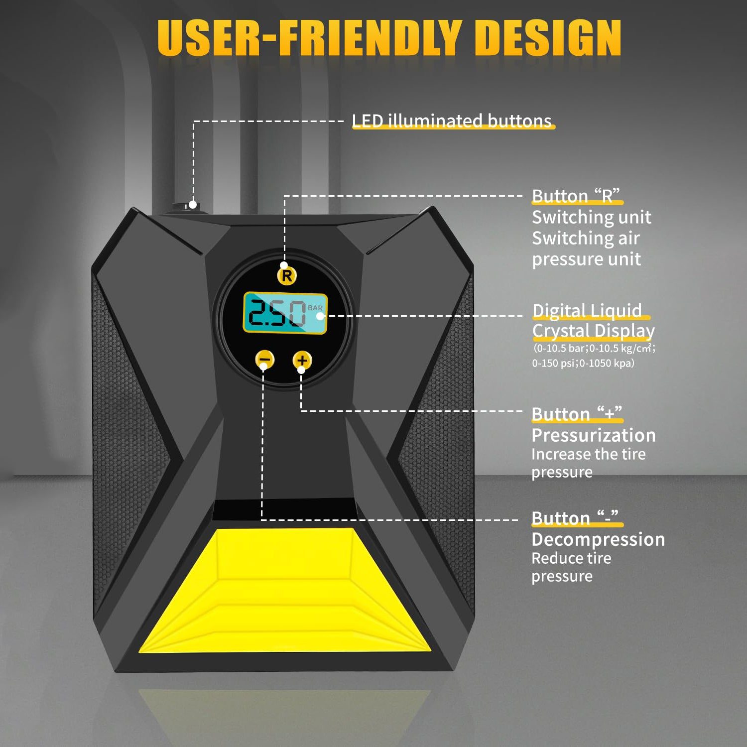 • Auto cut-off at the set PSI/Bar/KPa value for safer inflation