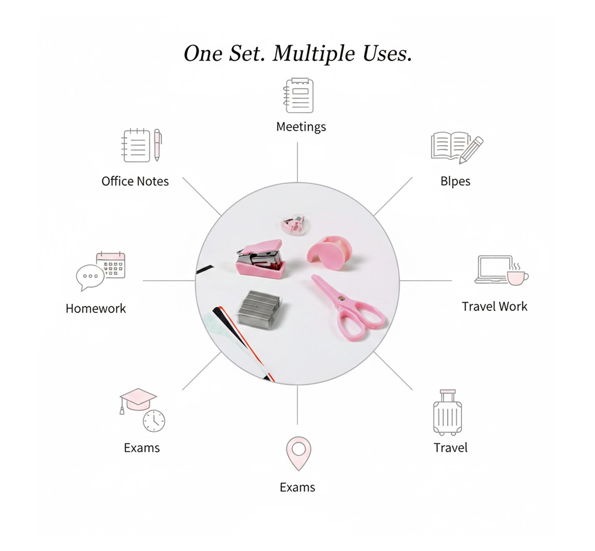This mini office stationery set contains all the essentials you need for your office, including a stapler, scissors, paper clips, tape dispenser, transparent tape, and staples. The ergonomic design makes it perfect for home and office use. Crafted with high-grade, durable materials, this stationery set is built to last.