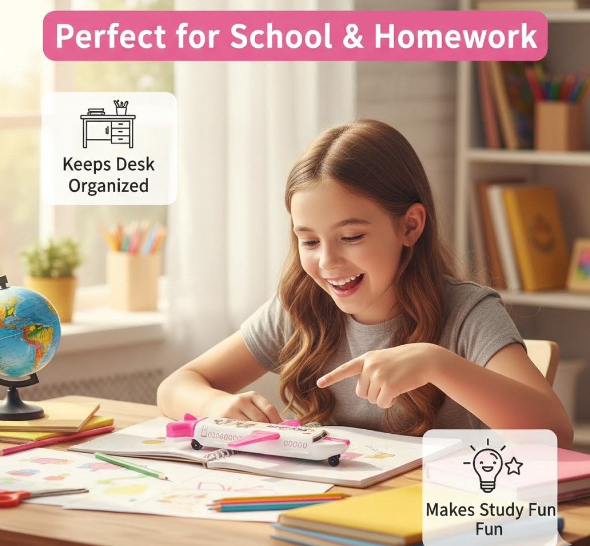 Multi-Functional Airplane-Shaped Compass Box with LED Light and Built-in Sharpener – Creative Stationery Organizer with Opening Compartments for Kids’ School Use – FLY AIR Design