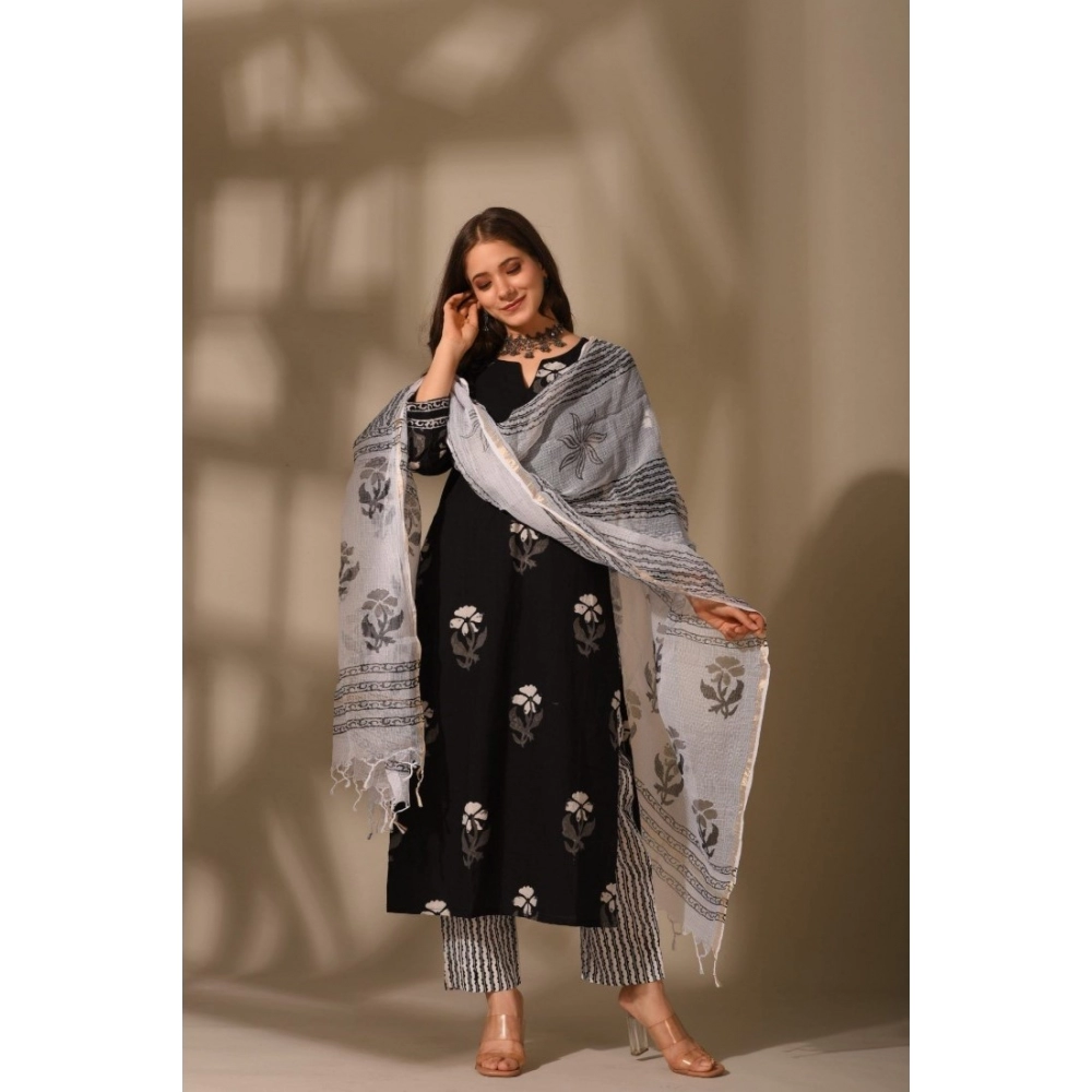 NariHaat Womens Black Floral Cotton Kurti Set with 3/4th Sleeves