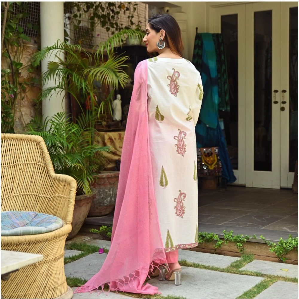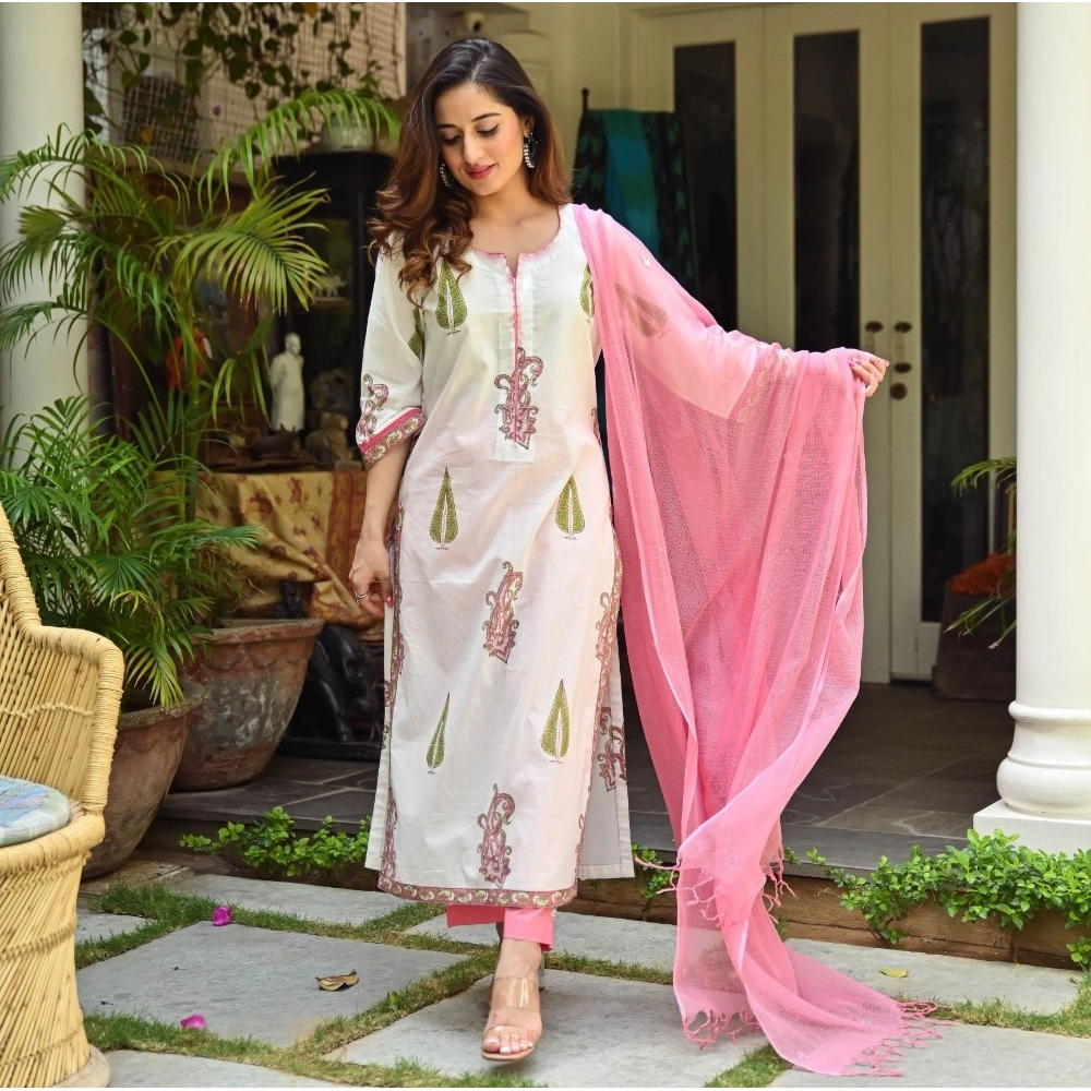 What are the care instructions for this white cotton kurti set? For best results, machine wash cold with like colors on a gentle cycle. Tumble dry low or hang dry in shade. Iron on a medium setting if needed, avoiding direct heat on prints to maintain fabric integrity and color vibrancy.