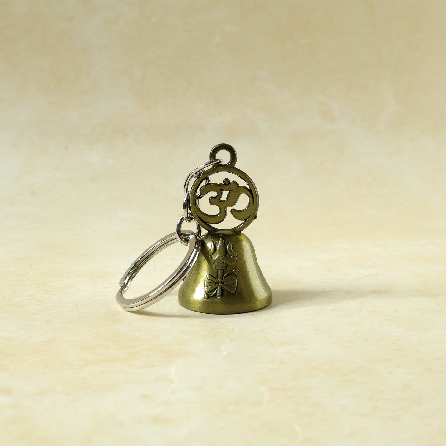 Om Symbol Temple Bell Metal Keychain – Antique Brass Finish Religious Key Ring for Car, Bike & Home Keys – Devotional Souvenir, Sturdy Ring & Chain, Compact & Lightweight (1 Pc)
