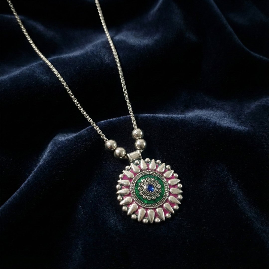 This beautifully crafted oxidized silver finish necklace features a traditional round mandala-style pendant accented with intricate detailing and vibrant enamel highlights. The finely designed pendant is paired with a sleek beaded chain that adds balance and elegance to the overall look. Inspired by classic ethnic jewellery aesthetics, this necklace effortlessly enhances sarees, kurtis, and fusion outfits. Its timeless appeal makes it suitable for everyday wear as well as festive and cultural occasions. A perfect blend of tradition and contemporary styling, this necklace adds grace and character to any jewellery collection.