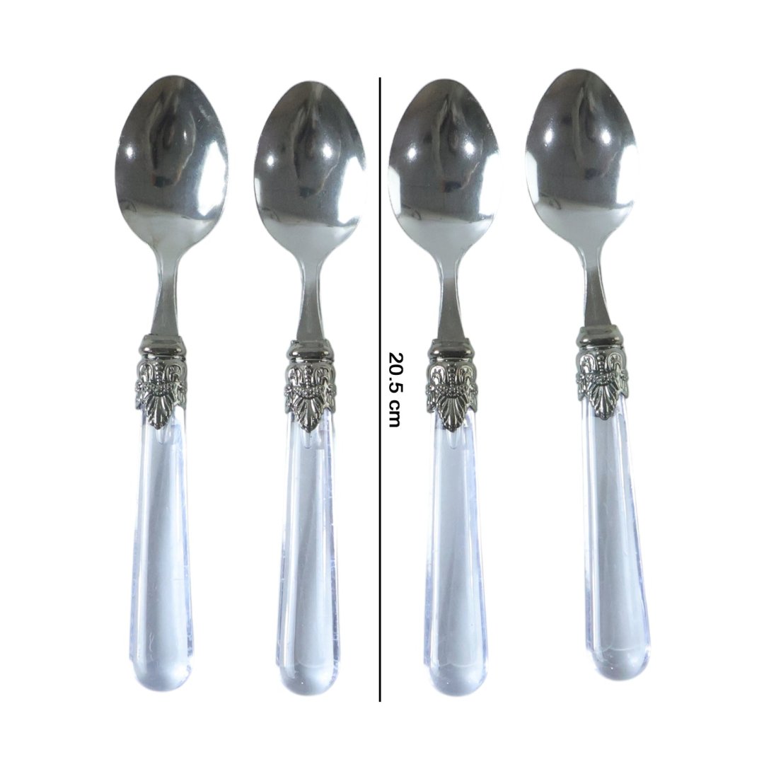Upgrade your dining experience with this elegant 4-piece spoon set designed for daily use as well as special occasions. Each spoon features a smooth stainless steel head paired with a stylish transparent handle that adds a modern and classy touch to your table setting. The ergonomic grip ensures comfortable handling while enjoying desserts, tea, coffee, fruits, or snacks. Built for durability and shine, these spoons are suitable for both home kitchens and formal gatherings. Their refined look makes them a perfect addition to your cutlery collection.