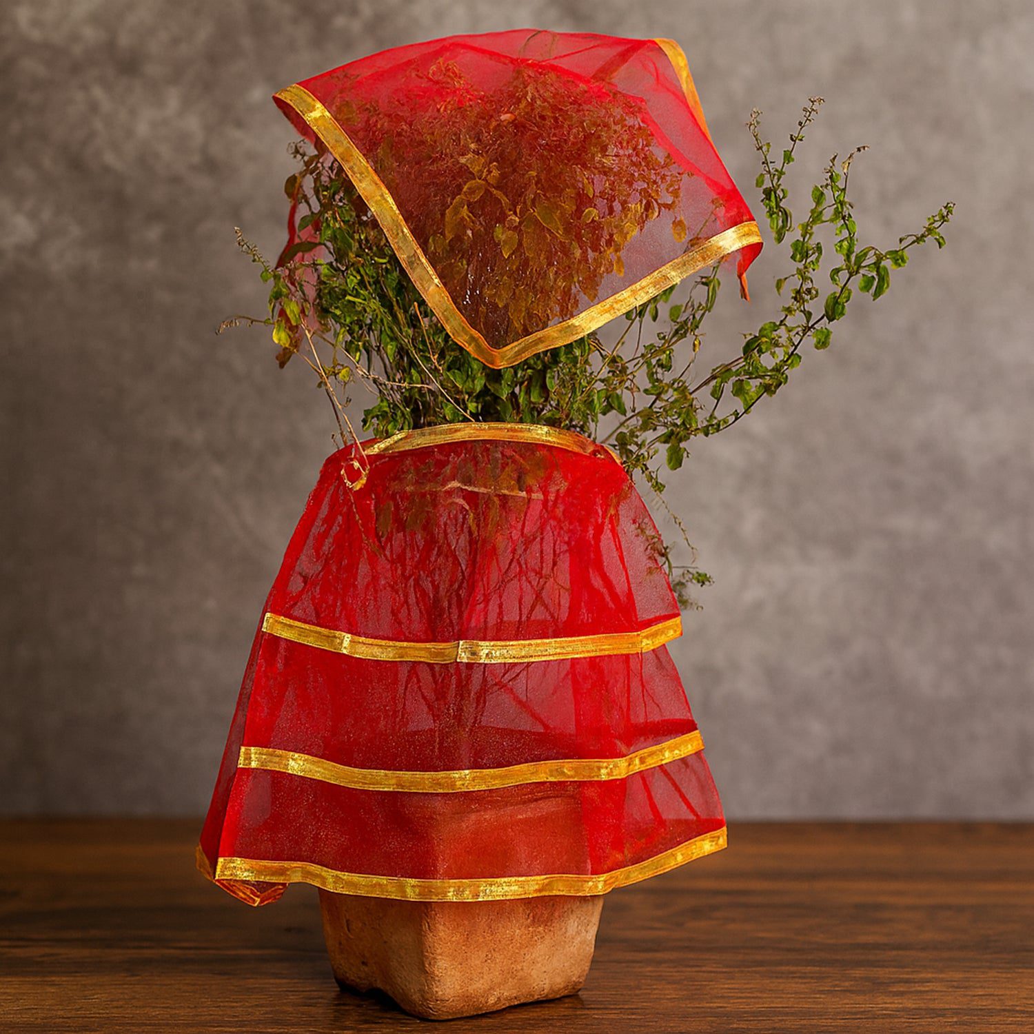 Enhance the spiritual ambiance of your home with this Premium Tulsi Vastra Pooja Cloth. Designed for religious and ritualistic purposes, this 2-piece set of vibrant red cloths with a shimmering gold border is perfect for adorning your Tulsi plant during poojas and offerings. The soft and delicate fabric is ideal for use in various religious ceremonies, ensuring a respectful and sacred presentation of your offerings. Each piece is made with care to provide a beautiful and elegant finish to your spiritual space.