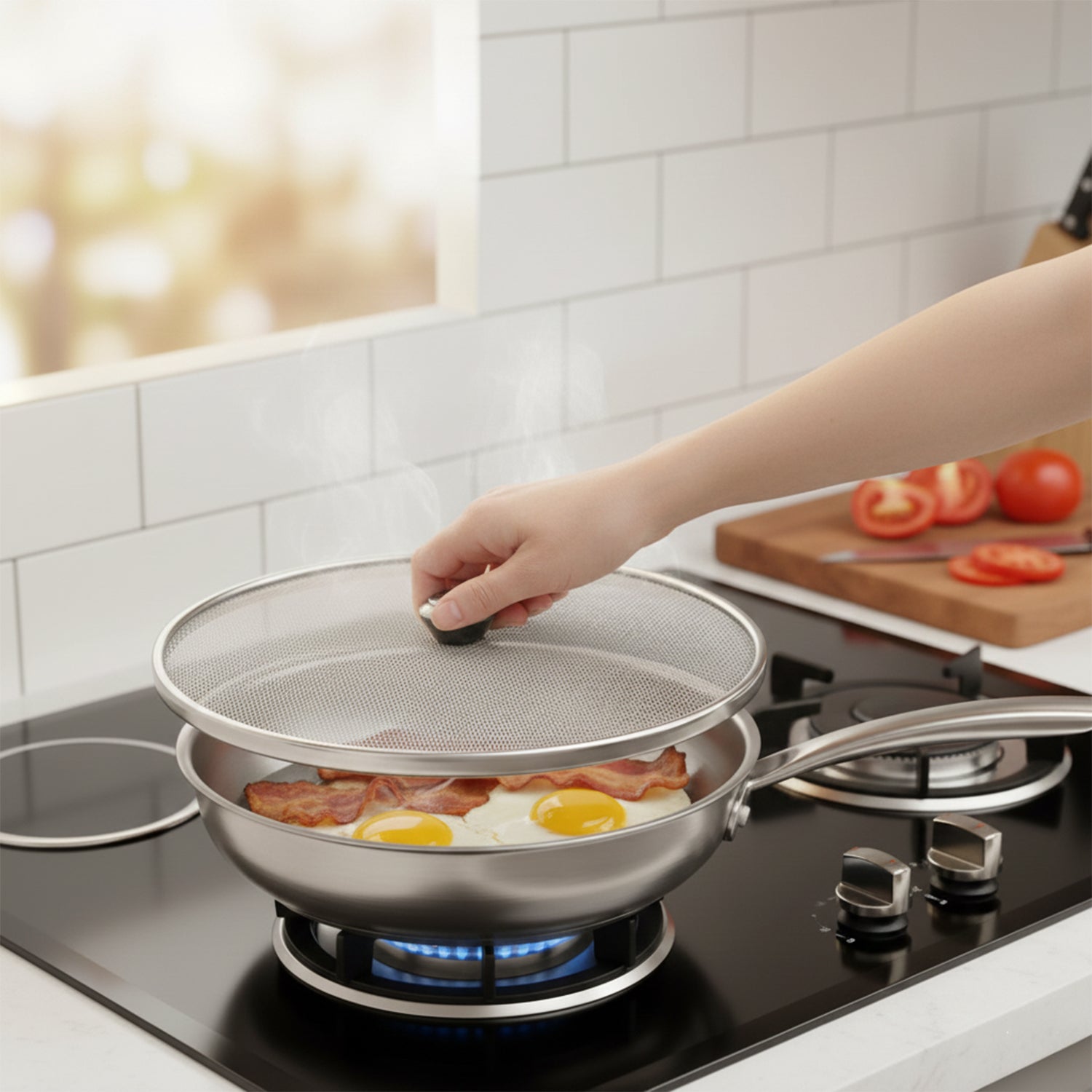 This stainless steel food net cover is a practical kitchen essential designed to protect food while cooking and serving. Made with a fine metal mesh, it allows steam to escape while preventing oil splashes, insects, and dust from coming into contact with food. The sturdy circular frame ensures a secure fit over frying pans, kadhai, plates, and bowls, while the central heat-resistant knob handle makes lifting and placing easy. Ideal for everyday Indian cooking, this net cover helps maintain cleanliness and safety in the kitchen without affecting cooking performance.