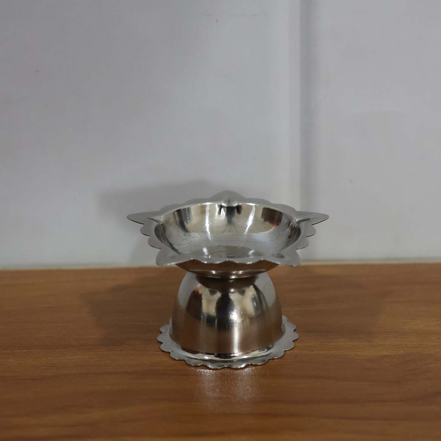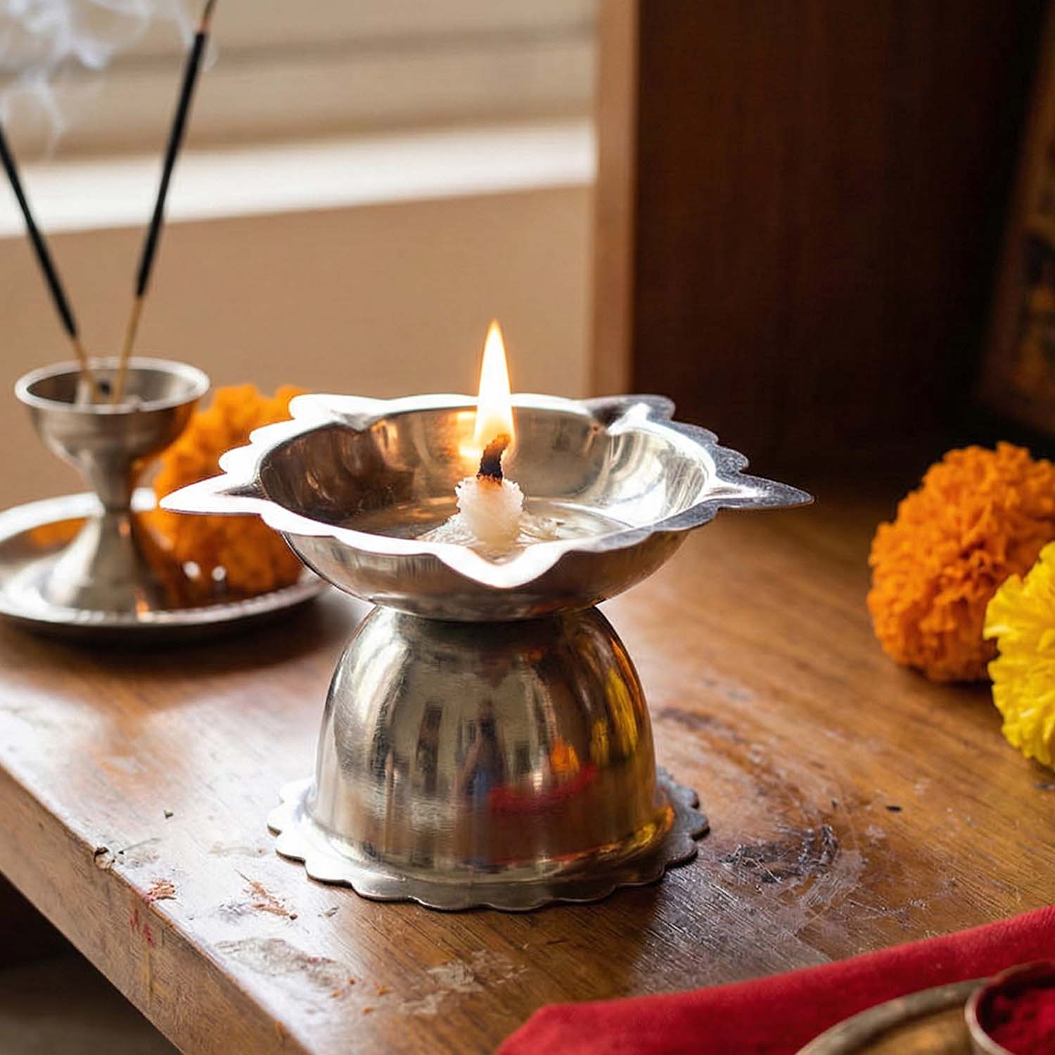 stainless steel diya stand, sunflower diya stand, sunflower design diya, small size diya stand, pooja diya stand, home temple diya stand, traditional oil lamp holder, steel oil lamp stand, pooja accessories, mandir diya stand, daily worship diya, hindu pooja items, puja lamp holder, diwali diya stand, festive decor diya