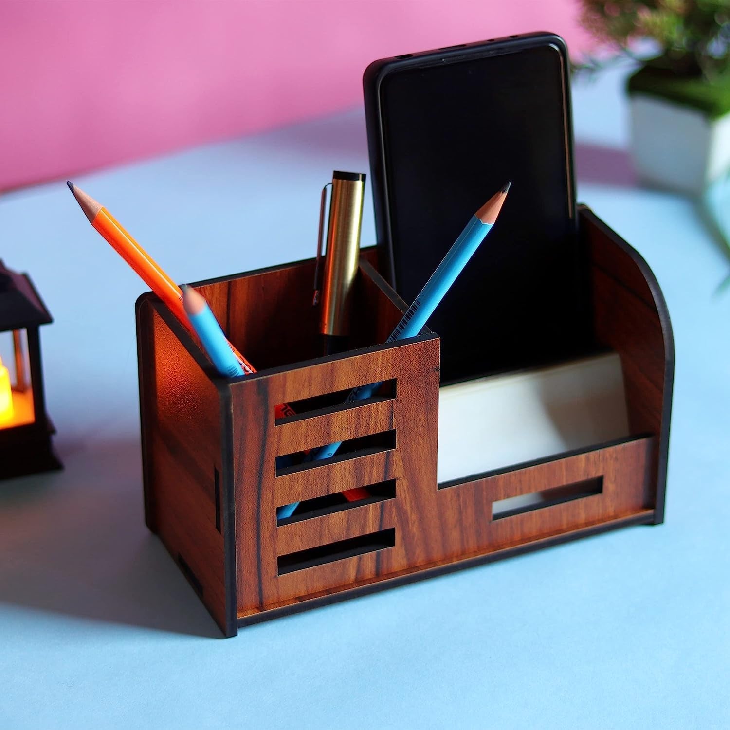 Premium Wooden Desk Organizer with Phone Stand, Pen Holder, Card Holder (1 Pc)