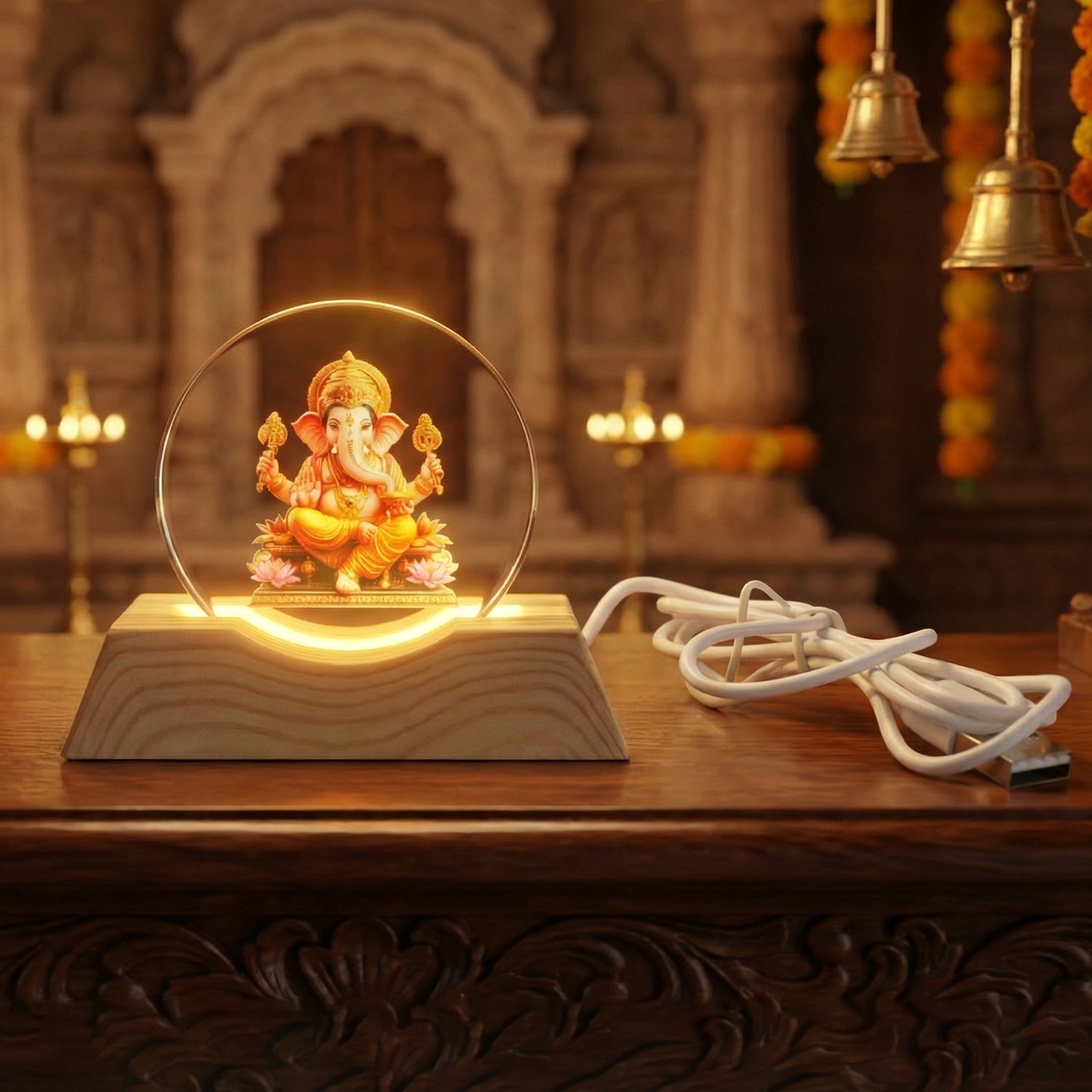 The lamp comes with a stylish wooden-finish base and works on USB power, making it easy to use at home, office, bedside, study table, or prayer room. Its soft golden glow makes it perfect for daily night lighting as well as festive decoration during Diwali, Ganesh Chaturthi, and special puja events.