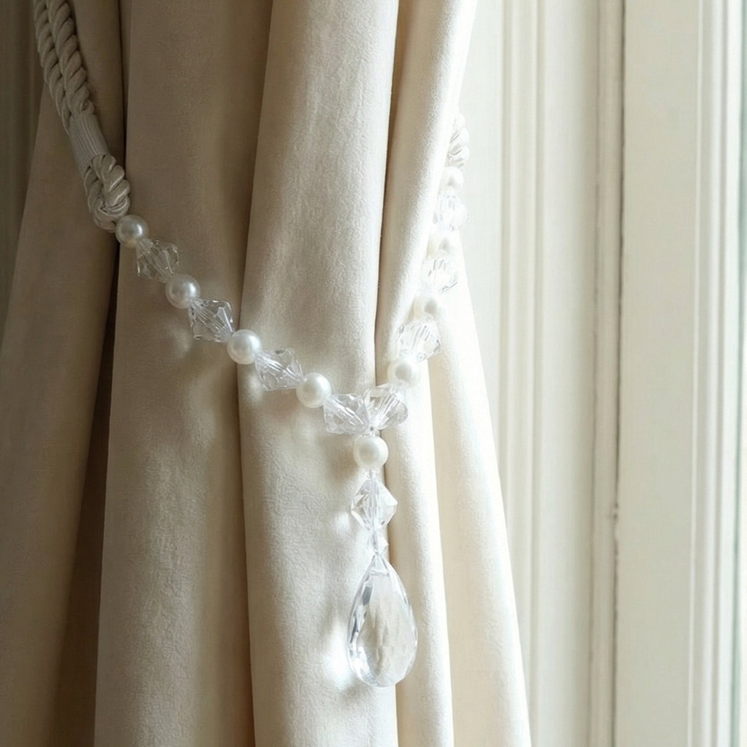 Add a refined and graceful touch to your home décor with this luxury crystal and pearl beaded curtain tieback. Designed with a beautifully twisted rope structure, this curtain holder is enhanced with alternating pearl-style beads, faceted crystal beads, and a stunning teardrop crystal pendant that reflects light elegantly. The flexible loop-style design allows you to secure curtains effortlessly without drilling, hooks, or wall damage. Perfect for enhancing the appearance of sheer, semi-sheer, or decorative curtains, this curtain tassel balances functionality with luxury styling. Its timeless design blends seamlessly with modern, classic, and elegant interior themes, making it a beautiful addition to everyday décor or special settings.