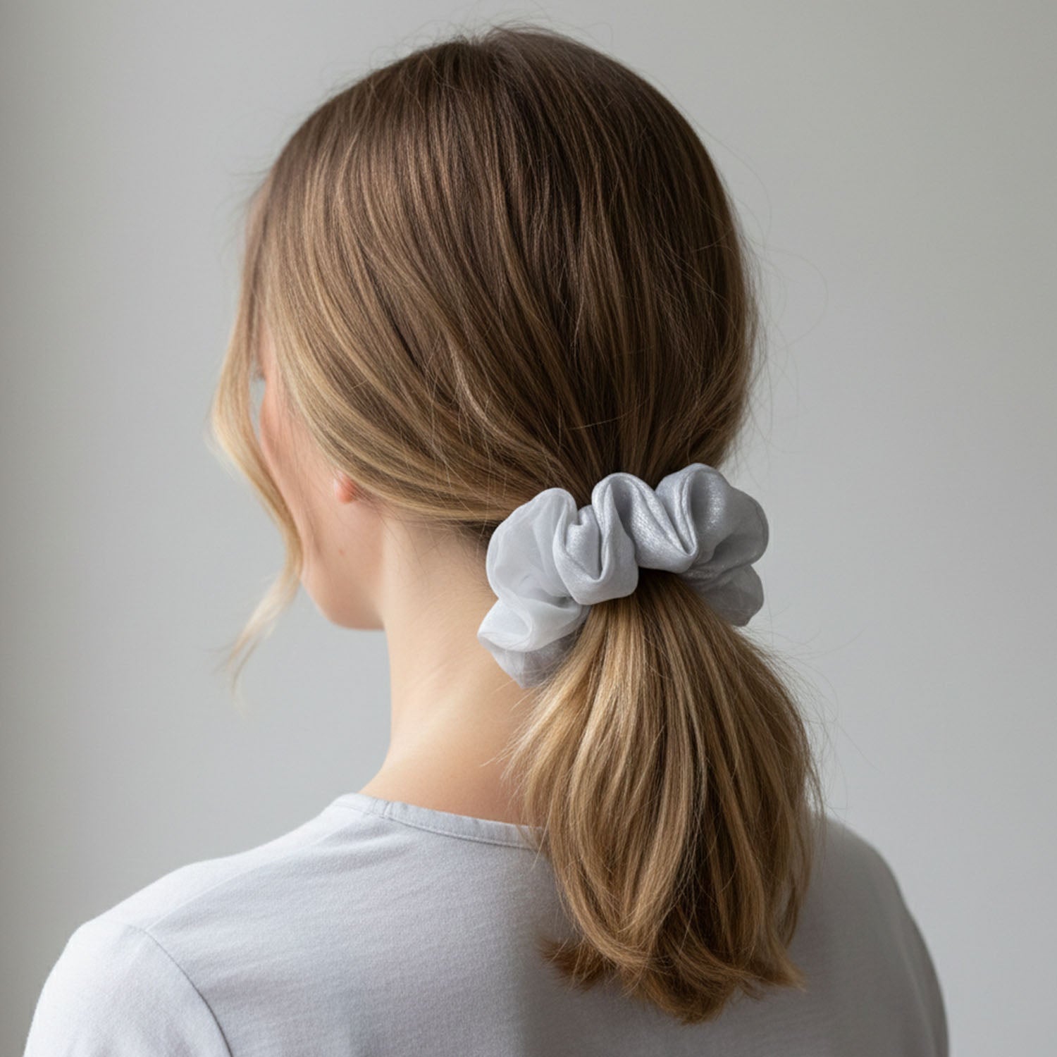 This dual-tone satin and mesh fabric hair scrunchie is designed to provide a comfortable hold while adding a refined and stylish touch to everyday hairstyles. The combination of smooth satin texture and airy mesh fabric creates a soft, voluminous look that enhances ponytails and buns without pulling or causing discomfort. Its stretchable design ensures a secure fit for regular hair styling needs while remaining gentle on hair. Easy to wear and remove, this scrunchie blends functionality with subtle elegance, making it suitable for daily use as well as light fashion styling. A versatile hair accessory that complements simple, minimal, and graceful looks effortlessly.