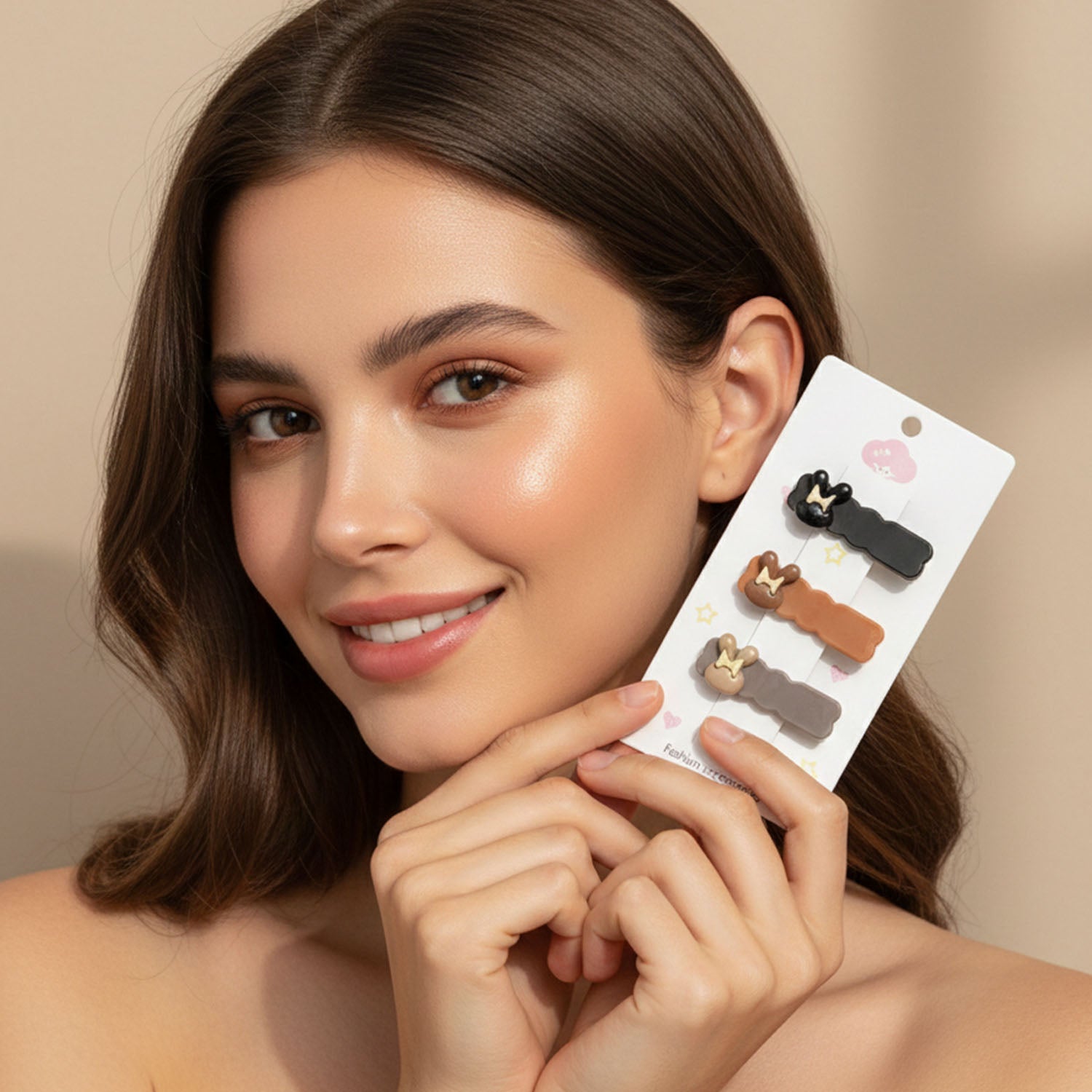 This decorative hair clip set features a cute character-inspired design with a subtle bow accent, adding a playful yet elegant touch to everyday hairstyles. Each clip is designed to hold hair securely while remaining lightweight and comfortable for extended wear. The smooth surface and gentle grip make these clips suitable for daily styling without causing discomfort or hair damage. Easy to clip on and remove, they are ideal for side hair styling, open hair looks, or simple everyday grooming. A charming accessory choice for regular use and casual fashion.