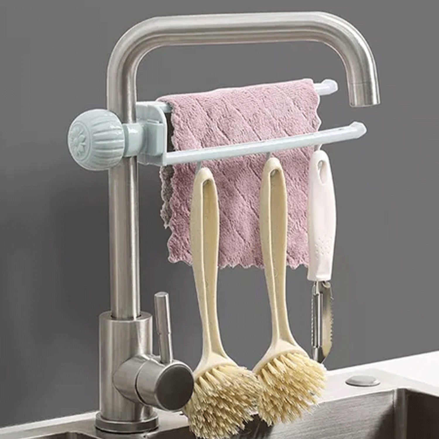 multipurpose sink faucet towel holder, tap mounted storage rack, faucet hanging organizer, kitchen sink sponge holder, bathroom tap towel rack, adjustable clamp faucet holder, sink mounted cleaning tool rack, space saving sink organizer, faucet sponge brush holder, hanging cloth holder for sink