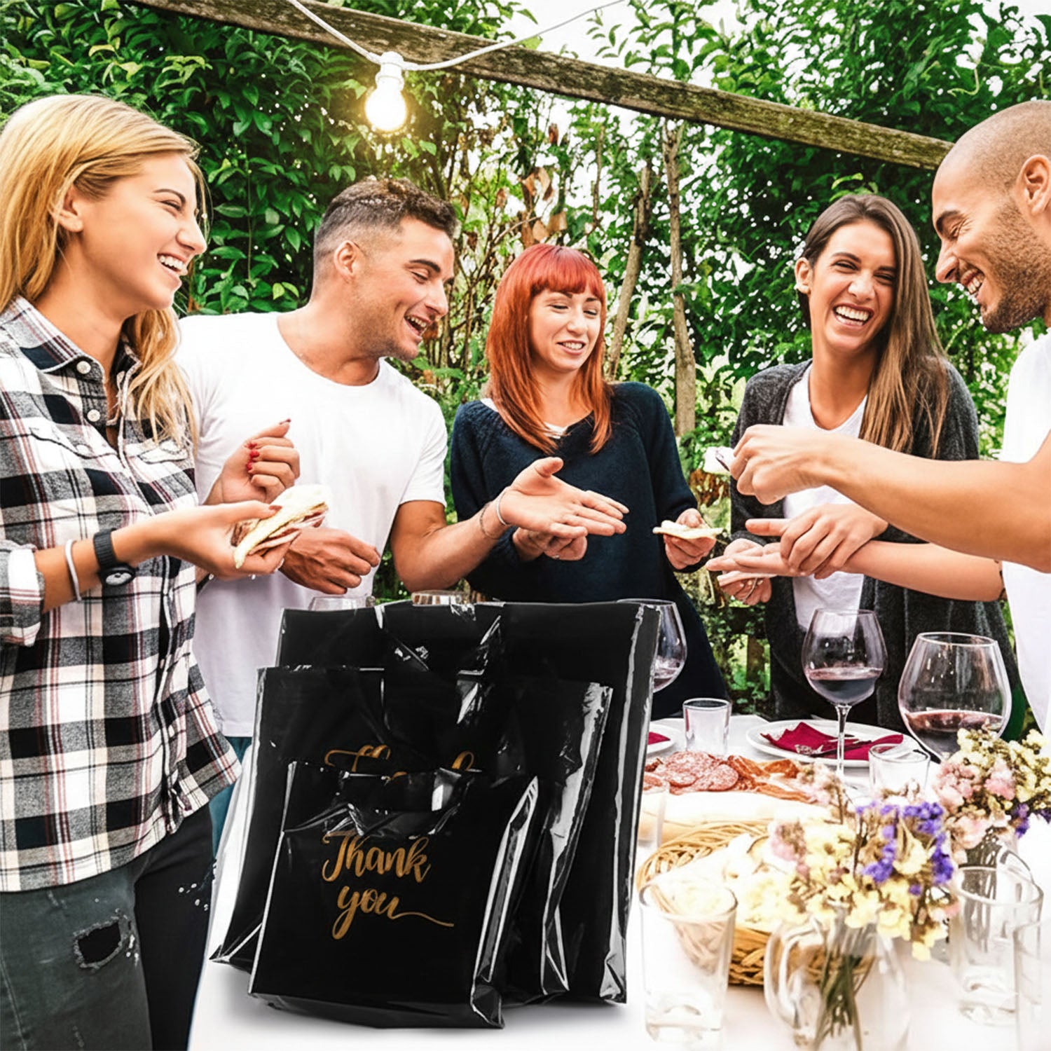 this black thank you printed carry bag set is designed for convenient and stylish carrying of items during shopping, gifting and daily use. the set includes 4 carry bags in mixed sizes, making it suitable for different packing needs. the bold “thank you” print gives a professional and premium look, ideal for retail shops, boutiques and takeaway services. these bags are lightweight yet durable and easy to fold and store when not in use. suitable for both personal and commercial use, this carry bag set helps keep items organized while offering a neat and presentable appearance.