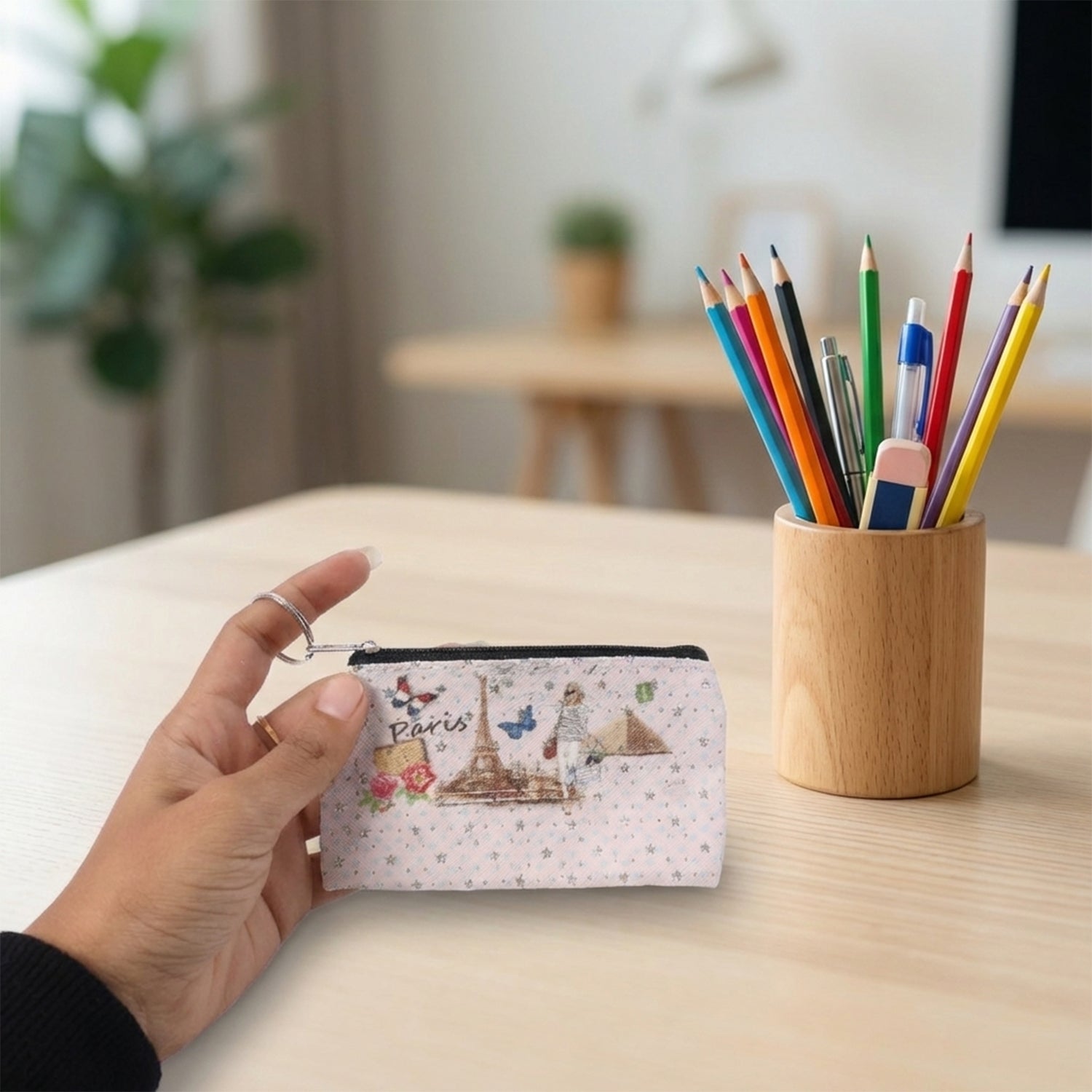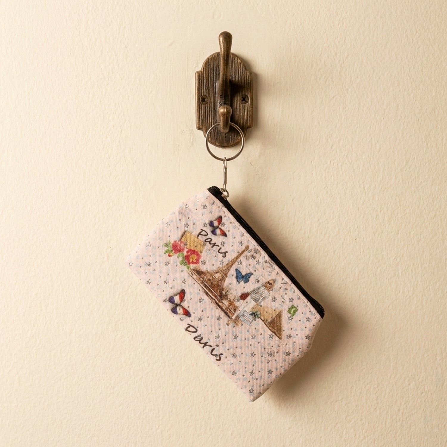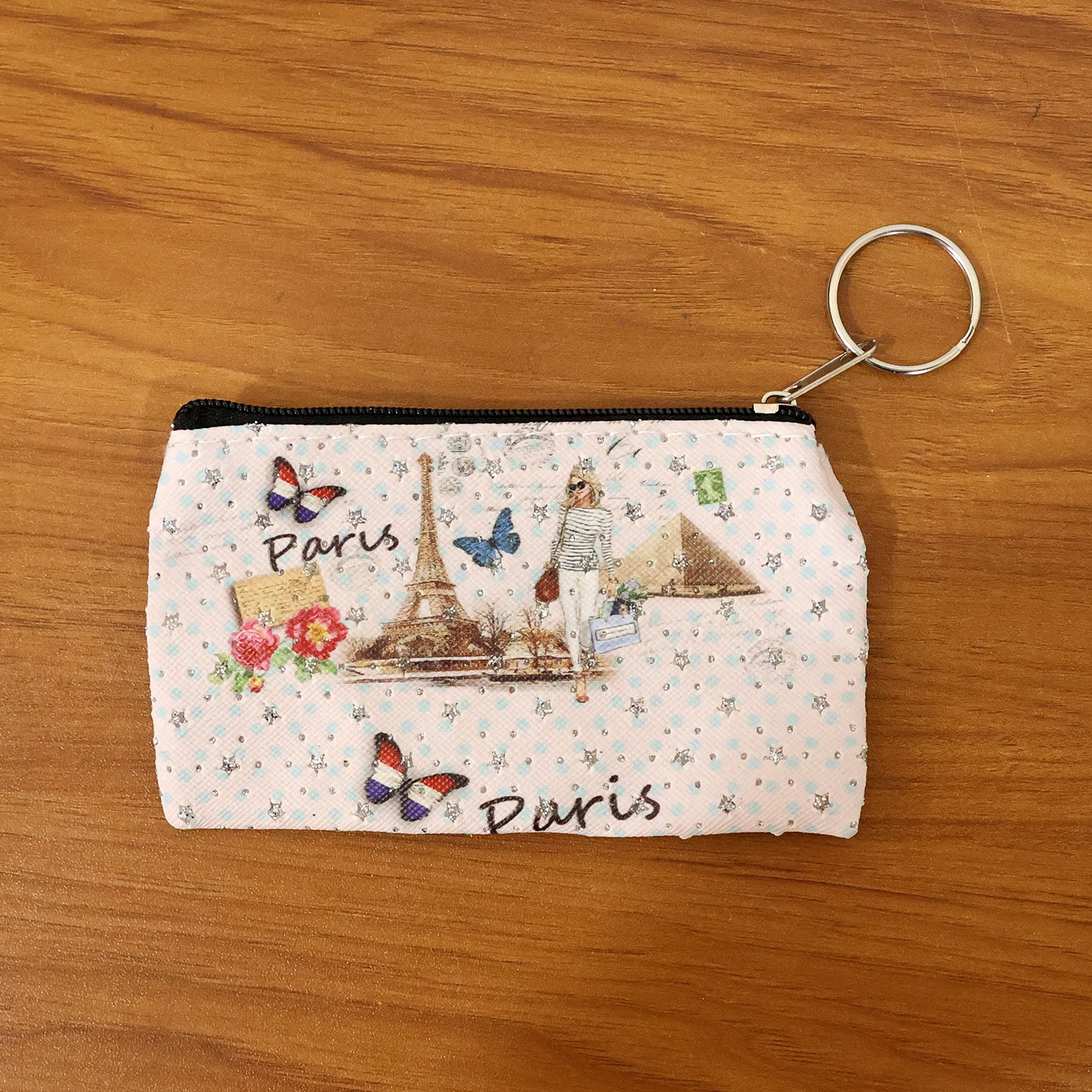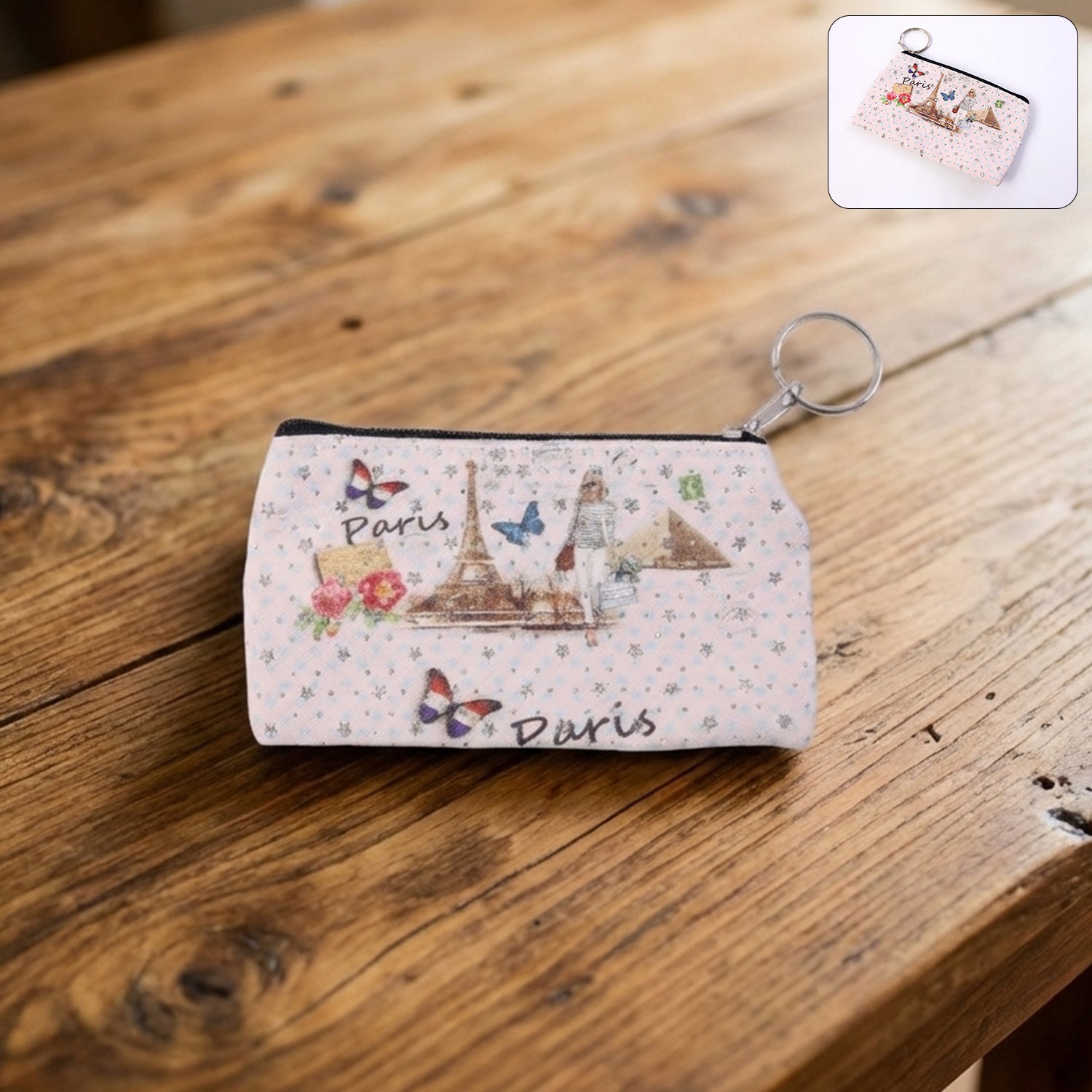 Paris print zipper pouch, small coin pouch, stationery pouch with key ring, zipper coin purse, compact storage pouch, multipurpose zipper pouch, coin and card holder pouch, mini stationery pouch, key ring pouch, travel coin pouch, cute printed pouch, daily essentials pouch, small accessory pouch, pen and pencil pouch