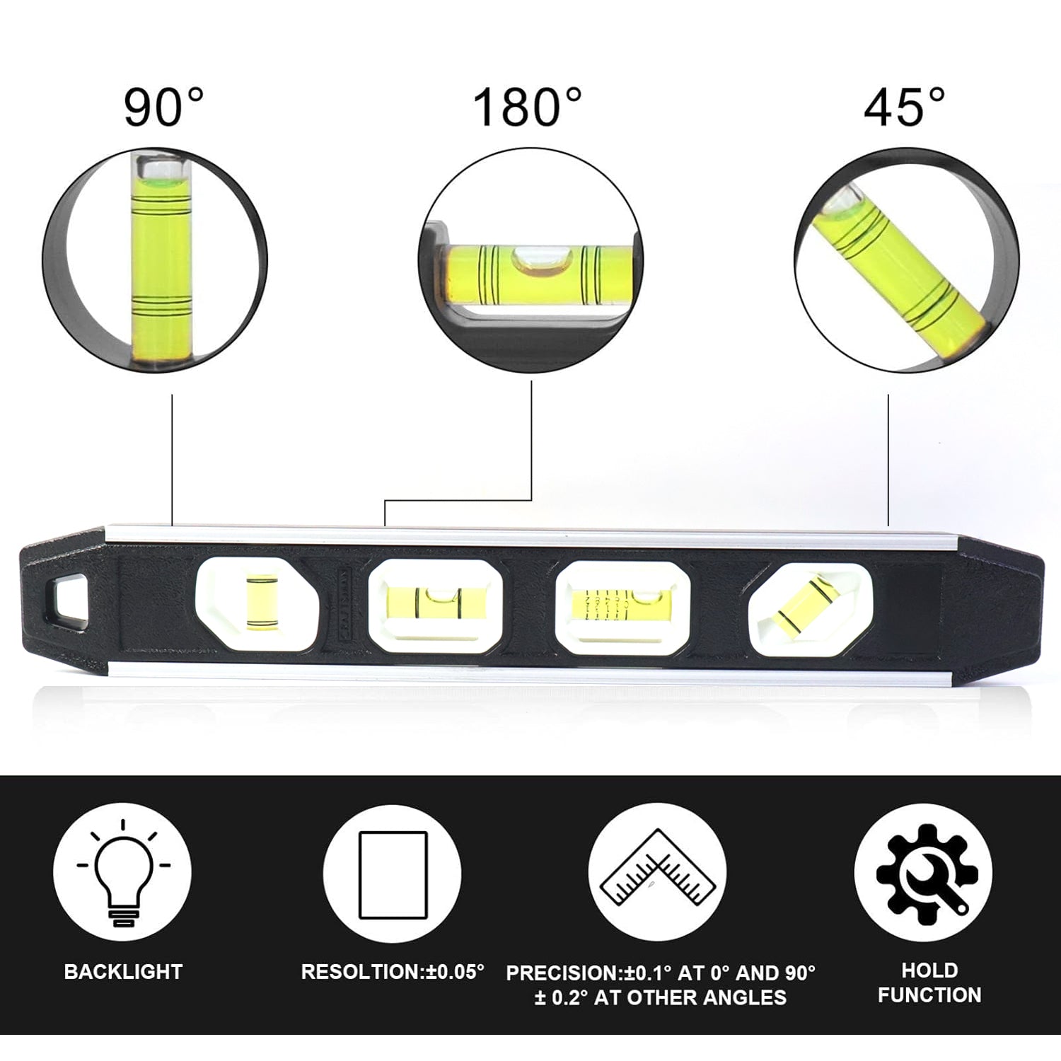 3 precision bubble vials for horizontal, vertical, and 45° angle measurements.
