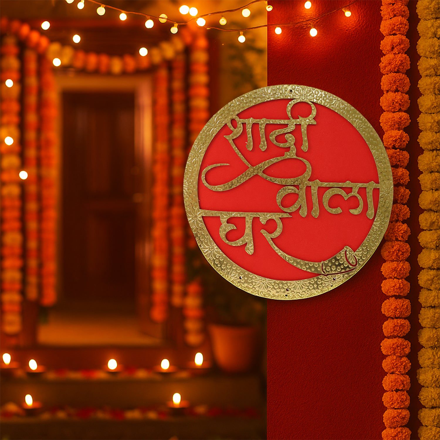 • Premium round wall décor with embossed “Shadi Wala Ghar” lettering in Hindi script