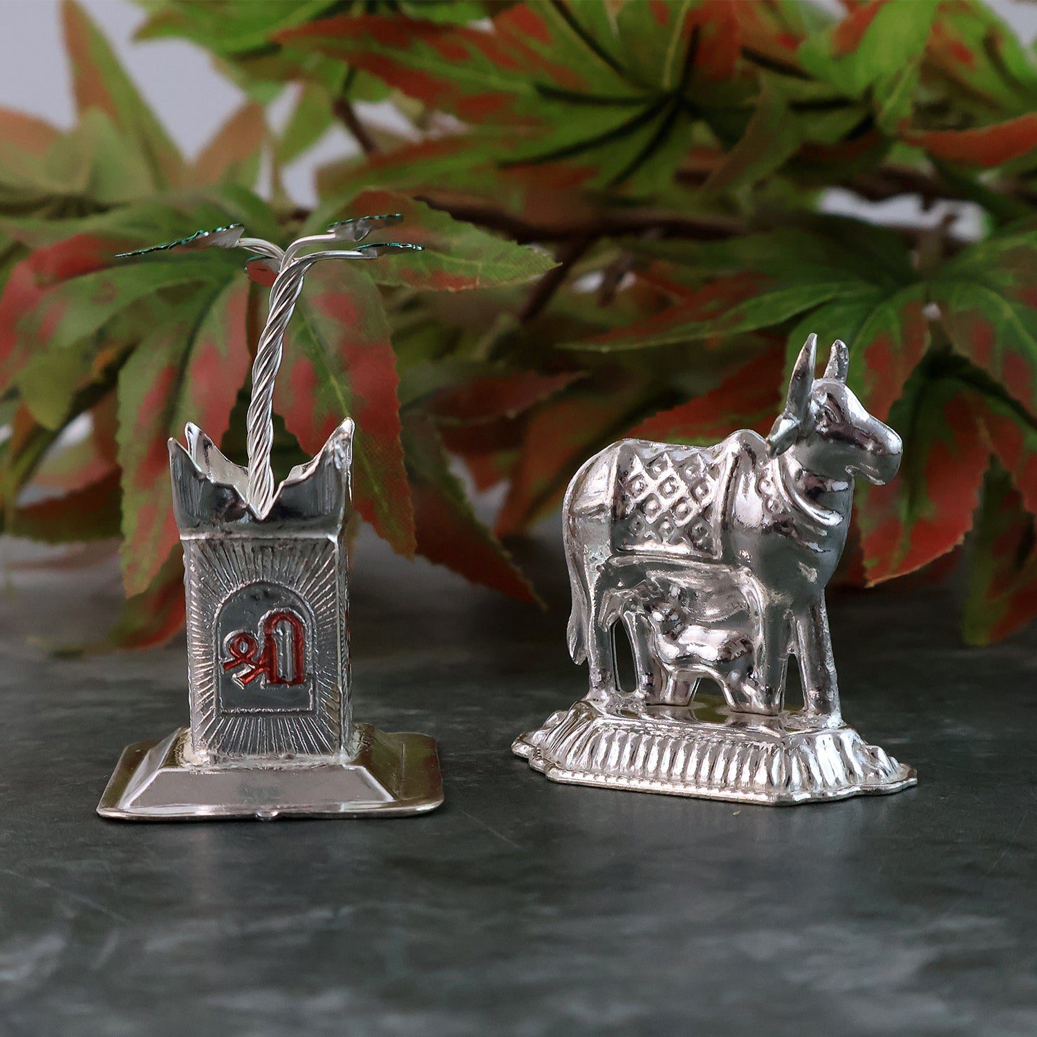 Silver-Plated Kamdhenu Cow & Tulsi Plant Pair – Pooja & Home Décor