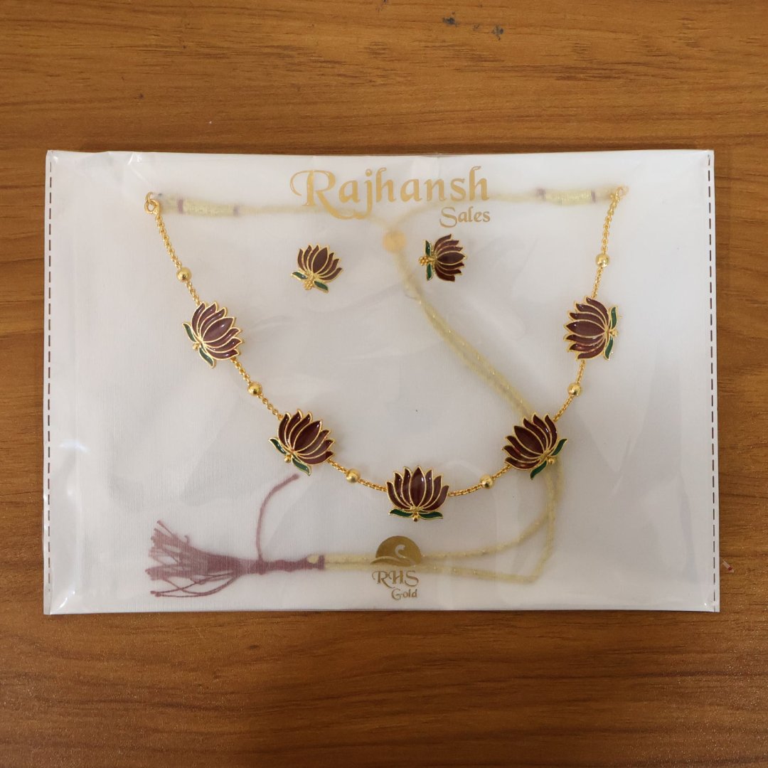 This traditional lotus-inspired necklace and earrings set is designed to enhance ethnic and festive looks with elegant detailing. The necklace features evenly spaced lotus motifs connected with a delicate chain and an adjustable thread closure for comfortable wear. The matching stud earrings complement the necklace design, creating a coordinated and graceful appearance. Ideal for pairing with sarees, Gehennas, and traditional outfits, this jewellery set is suitable for ceremonial, festive, and cultural occasions.