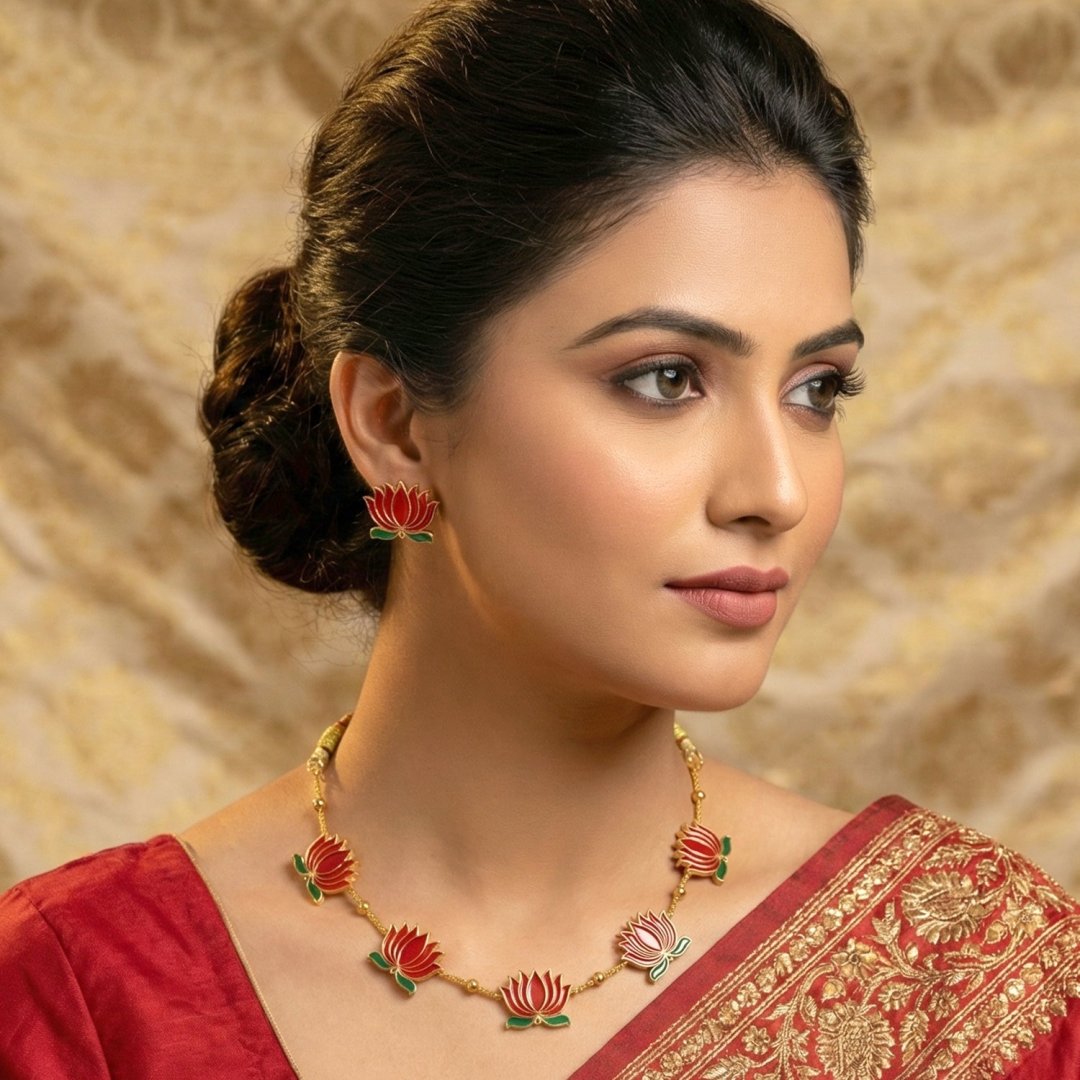 This elegant traditional jewellery set features beautifully crafted red lotus motifs arranged along a delicate necklace chain, paired with matching lotus stud earrings. Designed with an adjustable thread closure, the necklace offers a comfortable and customizable fit for different neck sizes. The rich lotus design adds a graceful cultural touch, making this set ideal for ethnic outfits, festive celebrations, and ceremonial occasions. Its lightweight construction ensures ease of wear while maintaining a refined traditional appearance.