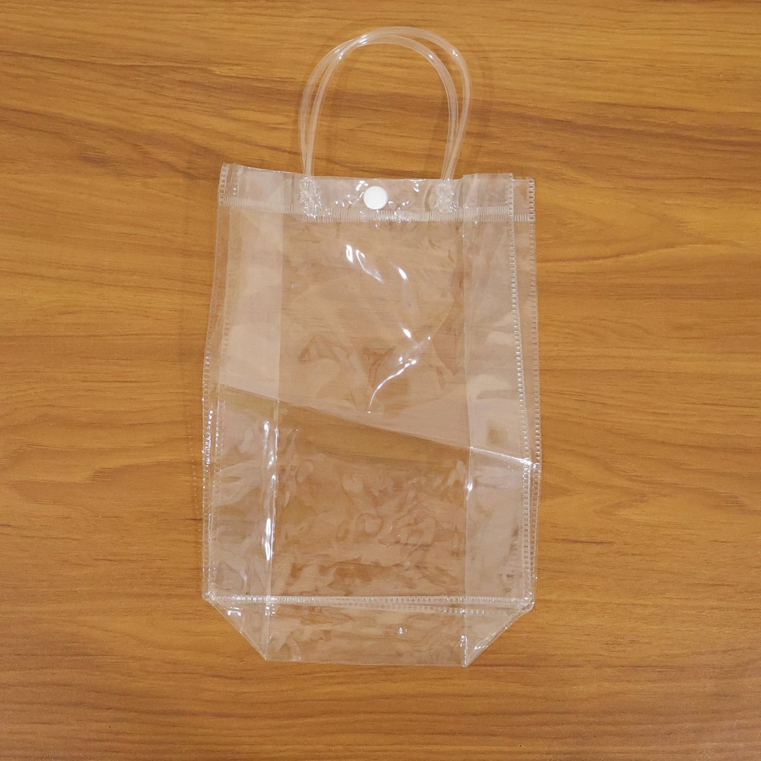 transparent PVC carry bag, carry bag with handle, button closure bag, travel PVC bag, shopping PVC bag, makeup storage bag, daily essentials bag, clear PVC tote bag, portable PVC bag, multipurpose travel bag, cosmetic PVC bag, waterproof carry bag, lightweight PVC bag, durable transparent bag, versatile storage bag, home and travel organizer